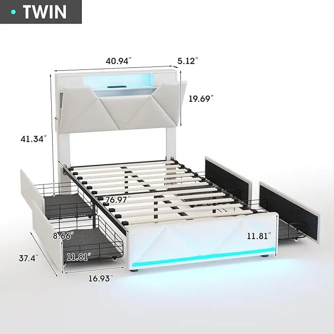 ·Abundant-Multi-functional storage space:This bed frame has four large capacity sliding drawers that offer ample place to collect sheets, accessories, and off-season clothing.There is hidden storage that flips open on the inside of the headbord where you can put your privacy stuff.Also storage shelves in the headboard provide enough space to charge or place your phones,clocks,ipad,glasses, and other decorations,etc.