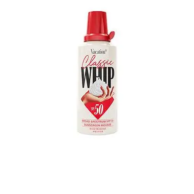 ·Vacation Classic Whip SPF 50 Sunscreen Mousse is a "lighter-than-air" sunscreen featuring an authentic "tilt valve" actuator that produces perfect, star-shaped mountains of foam inspired by everyone's favorite after dinner indulgence.