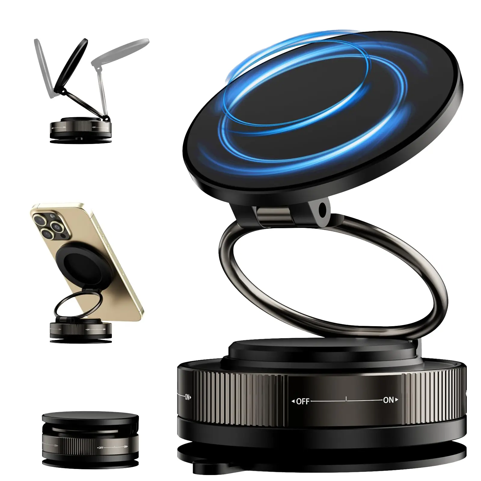 ·【2X Stronger Magnetic Grip】 This vacuum magnetic car phone mount features a precision-engineered ring design with dual-layer premium magnets, delivering twice the magnetic force of standard magnets for a secure, shake-free hold. The magnets align perfectly with your phone's built-in magnetic coils, ensuring instant attachment and stability. Tested over 1,000 times in real-world scenarios—including sudden stops, sharp turns, and rough roads—it keeps your phone firmly in place no matter the drive. Plus, the smart magnetic field design guarantees zero interference with GPS or wireless charging