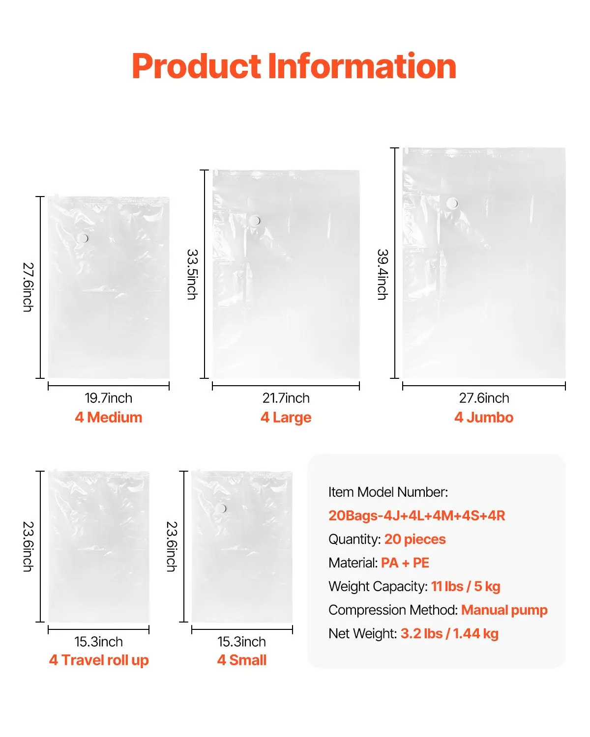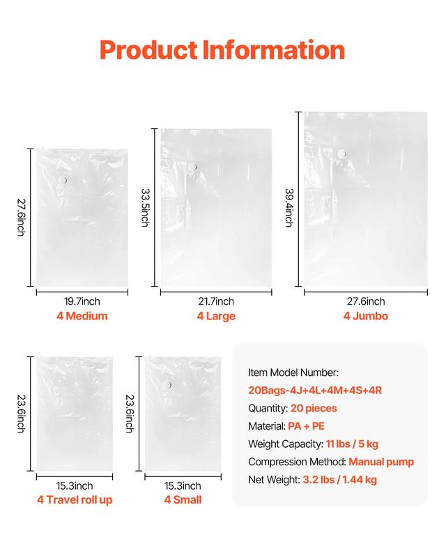 ·Multi-Purpose Storage Set: Includes 20 storage bags in 5 sizes, suitable for large comforters, pillows, or clothing, meeting all your storage needs.