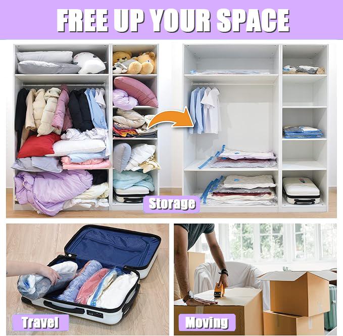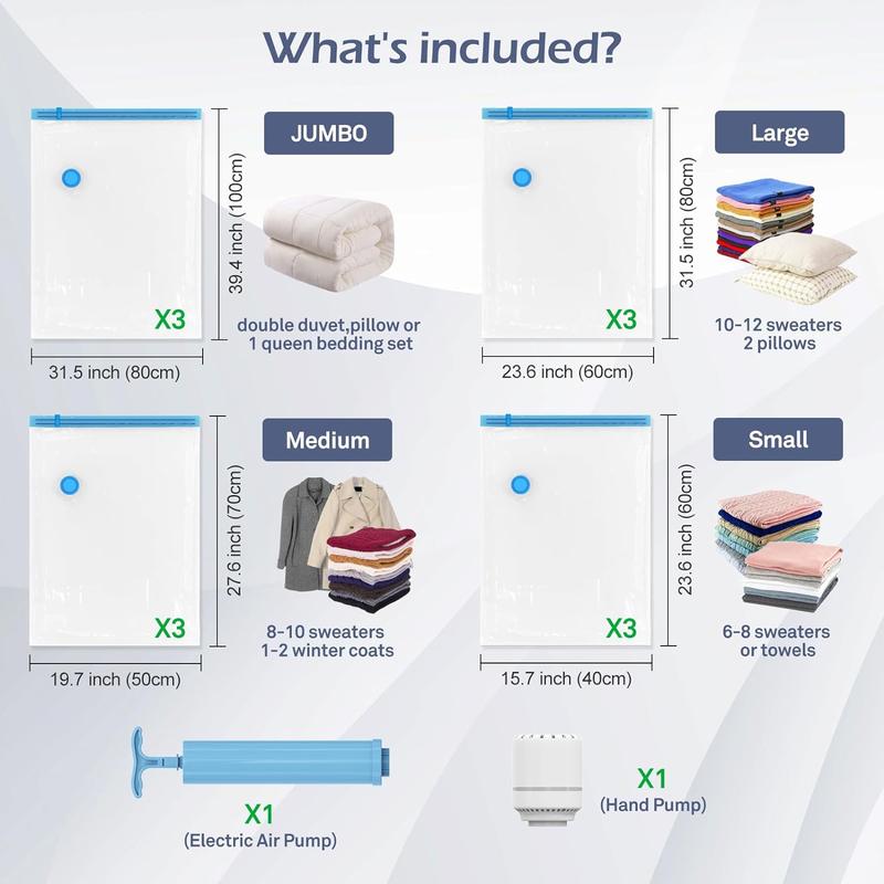 ·Multiple Size Choice: Our vacuum storage bags are offered in a full range of sizes, include 3 Jumbo Storage Bags (39.4 x 31.5 in), 3 Large Storage Bags (31.5 x 23.6 in), 3 Medium Storage Bags (27.6 x19.7 in), 3 Small Storage Bags (23.6 x15.7 in), perfect for a range of items! Store your clothes, coats, duvet, bed sheets, towels, blankets, and more!