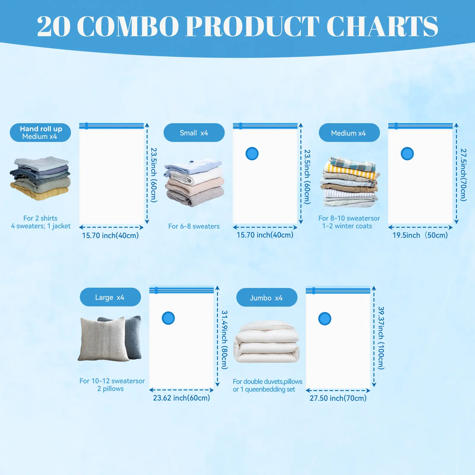 Compré dos cajas y para mí suerte las bolsas de 40x60 No trajo la balbula de aspiración, en pocas palabras no trajo el círculo azul para poder comprimirlas!