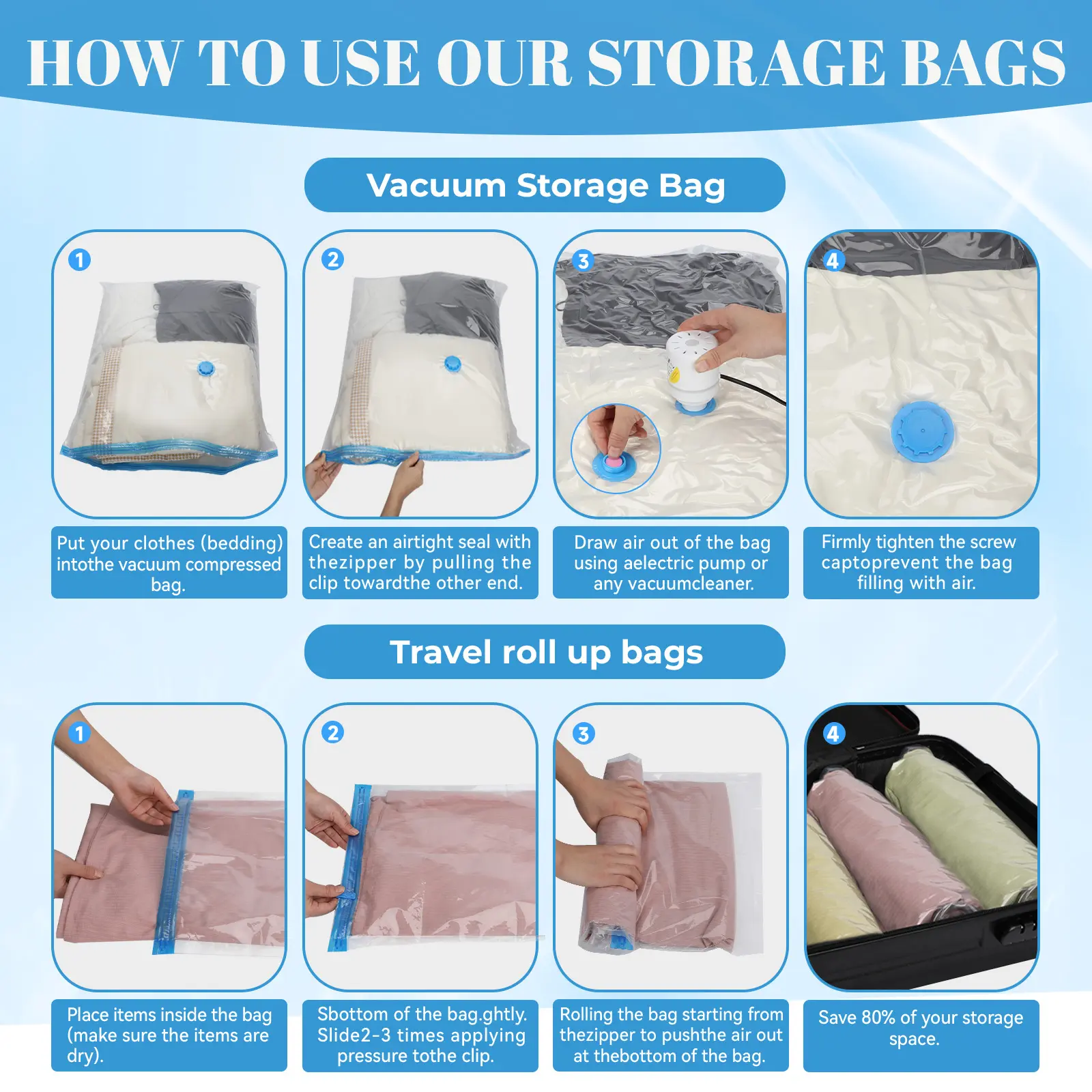 El primer detalle que noté fue que el cordón de la pompa está súper corto asegúrate de tener una extensión, las bolsas están ok! No me impresionó el material realmente y por último asegúrate de revisar estas las bolsas a los 7 días por que les entra aire y tienes que volver a desinflar.