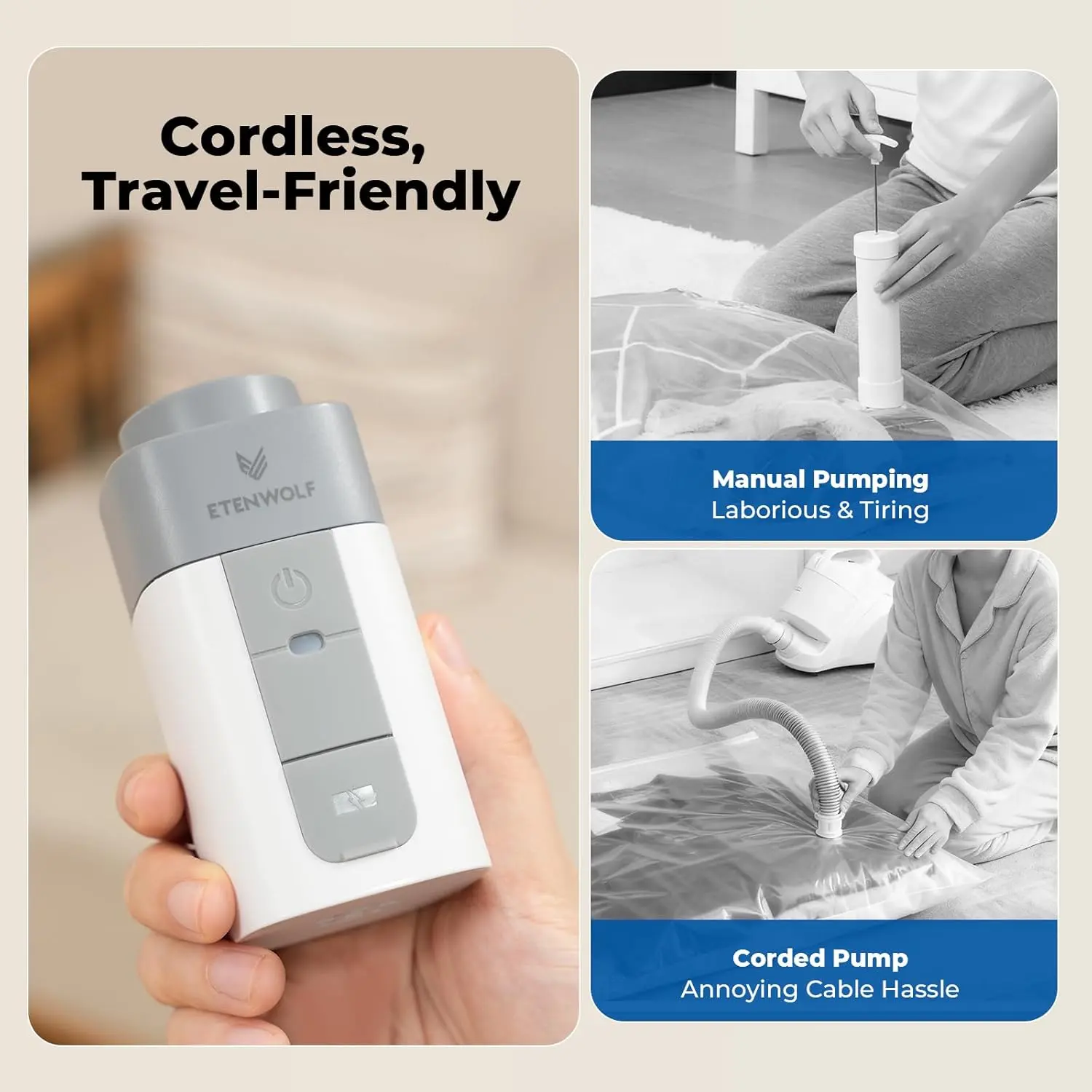 ETENWOLF vacuum storage bags provide 80% more storage space. The 1500mAh cordless air pump, measuring 1.9'' × 1.9'' × 3.5'' and weighing 5 oz, compresses over 90 bags in 10–15 seconds. Fast Type-C charging powers the pump for 1 hour. Note: Unplug before use.