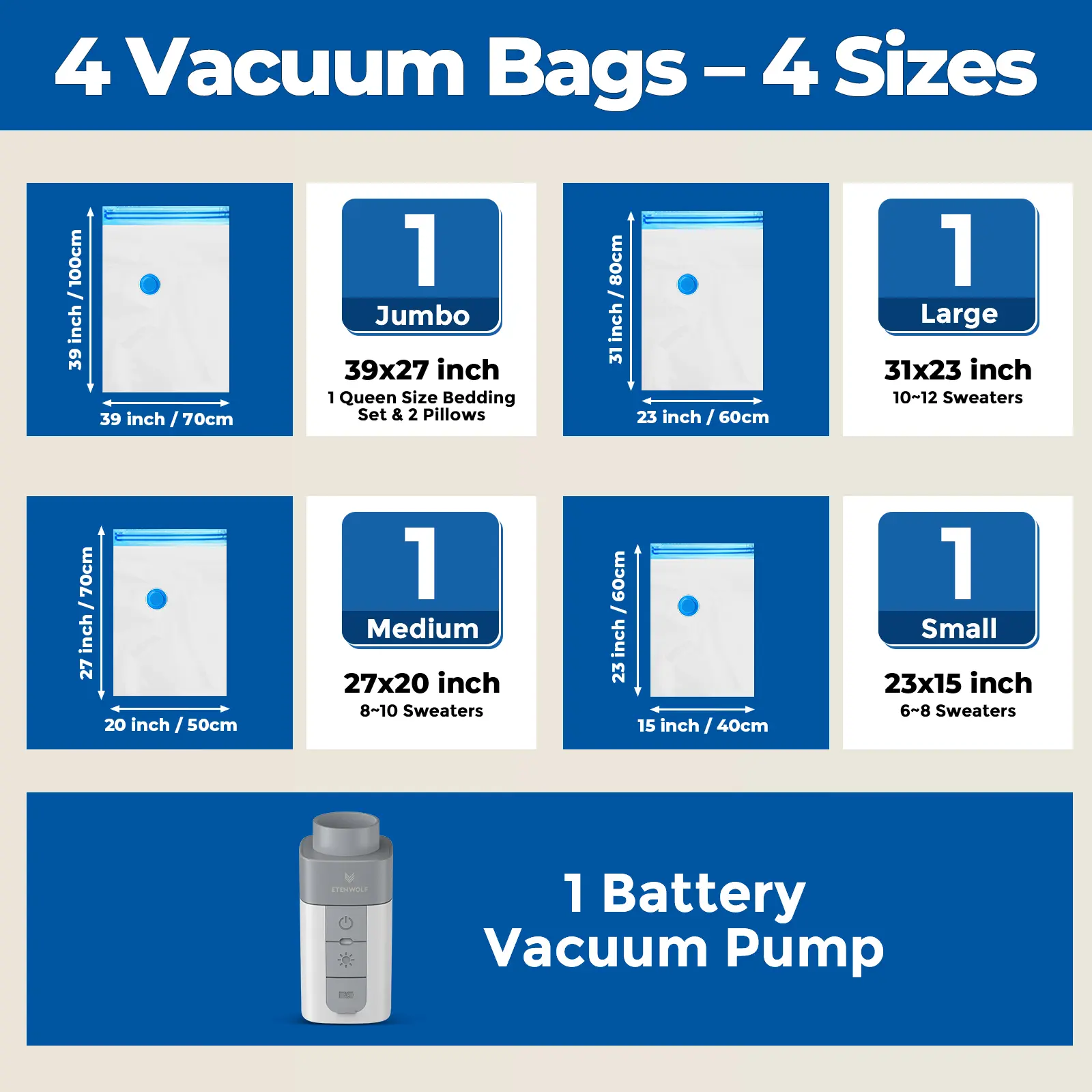 ·1 Jumbo, 1 Large, 1 Medium, and 1 Small vacuum storage bags.