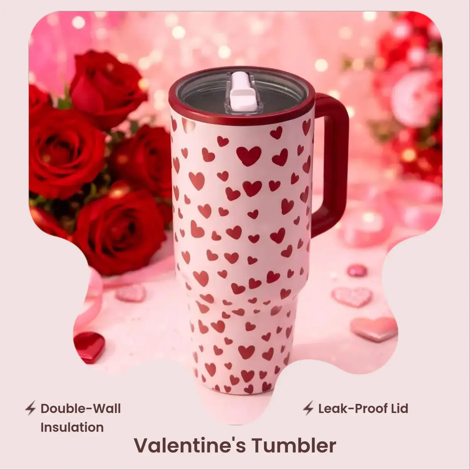 5. 40oz Valentine Insulated with Heart Pattern, Double Wall Vacuum Stainless Steel Design for Long Lasting Hot and Cold Drinks, Leak Proof Lid, Large Capacity Gift Mug for Women Men Lovers Holiday Celebration, Vacuum Insulated Flask