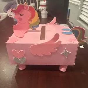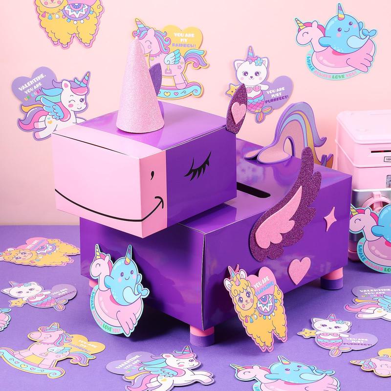 ·purple:The package included 30 Valentine cards, 2 craft box, enough doublesided tape and a set of DIY crafts for you to decorate your card box.The unicorn greeting cards also have 5 different design.