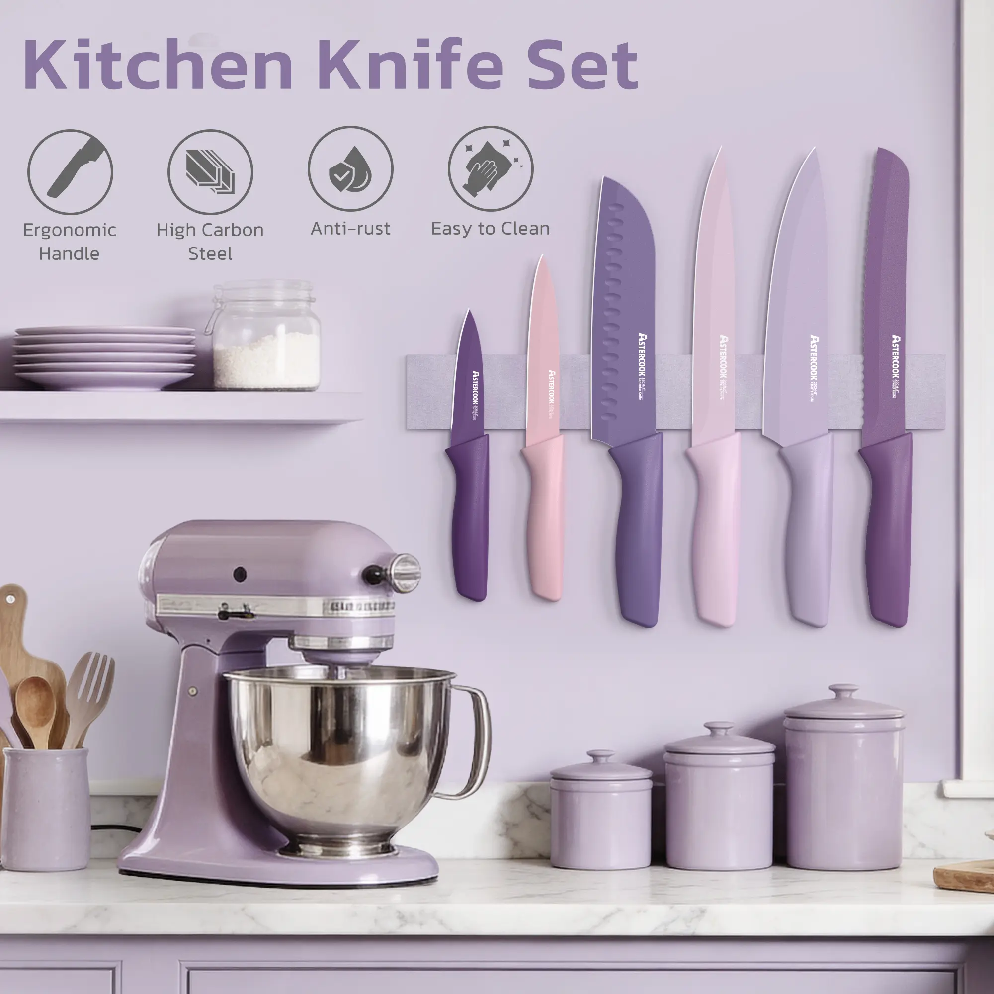 5. 【Valentines Day Sale】Astercook 7-Piece Kitchen Knife Set – Valentine’s Day Gift for Her, Healthy Anti-Rust Coated Stainless Steel Knives, Dishwasher Safe, Chef Knife Set with 6 Blade Guards, Elegant Purple