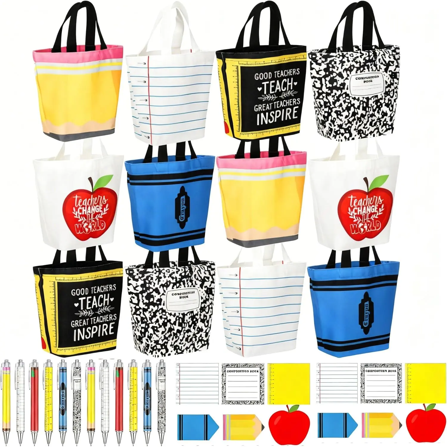 This teacher appreciation bundle includes 12 canvas tote bags, 12 packs of fun sticky notes (30 sheets per pack), and 12 novelty ballpoint pens, totaling 36 pieces in 12 gift sets; With abundant quantities and diverse styles, it fully meets your gifting needs for teachers or daily use scenarios.