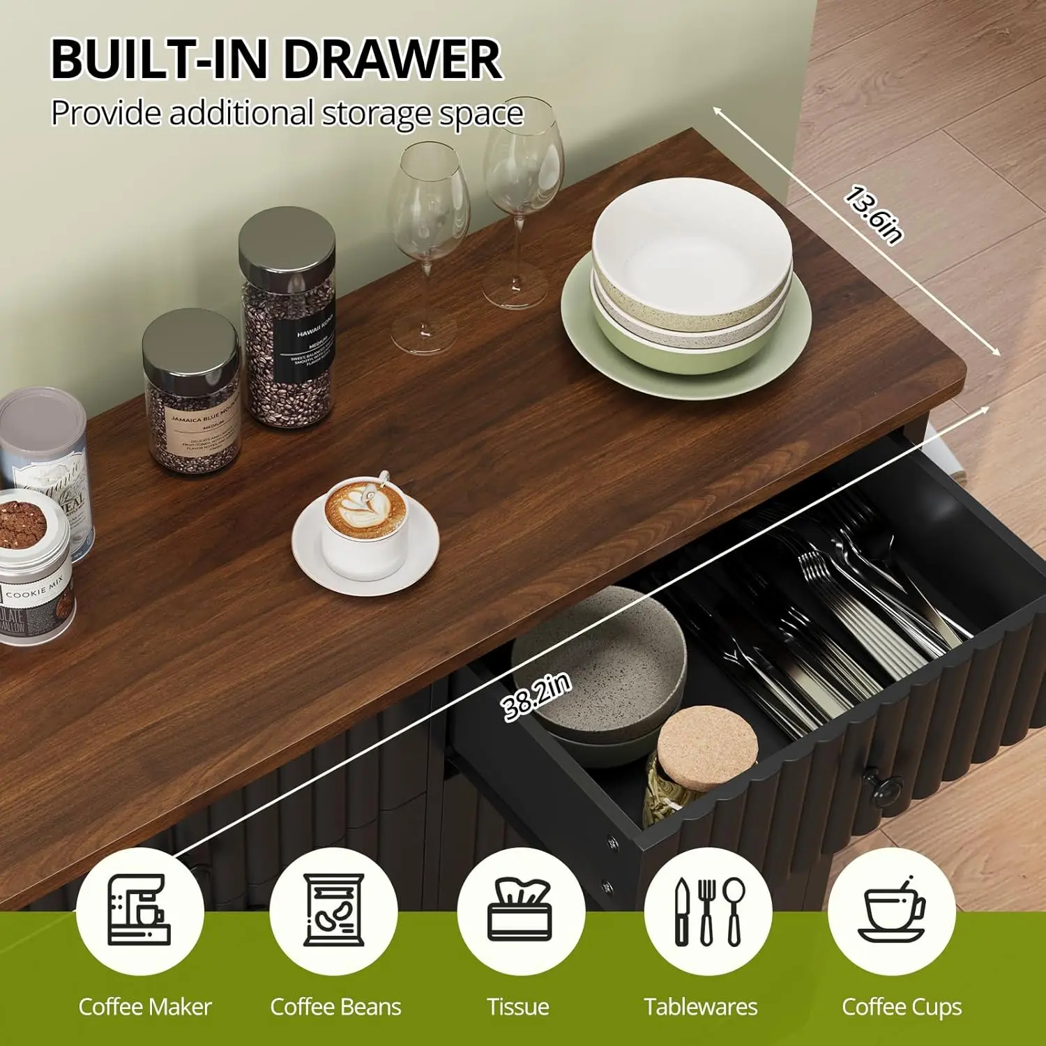 [Space-Saving Design]: Spacious wooden top fits coffee makers, cups, paper towels.Equipped with 2 pull-out drawers (17.1"W*6.5"H each) to store towels/toiletries, dust/moisture-proof for organized spaces.