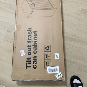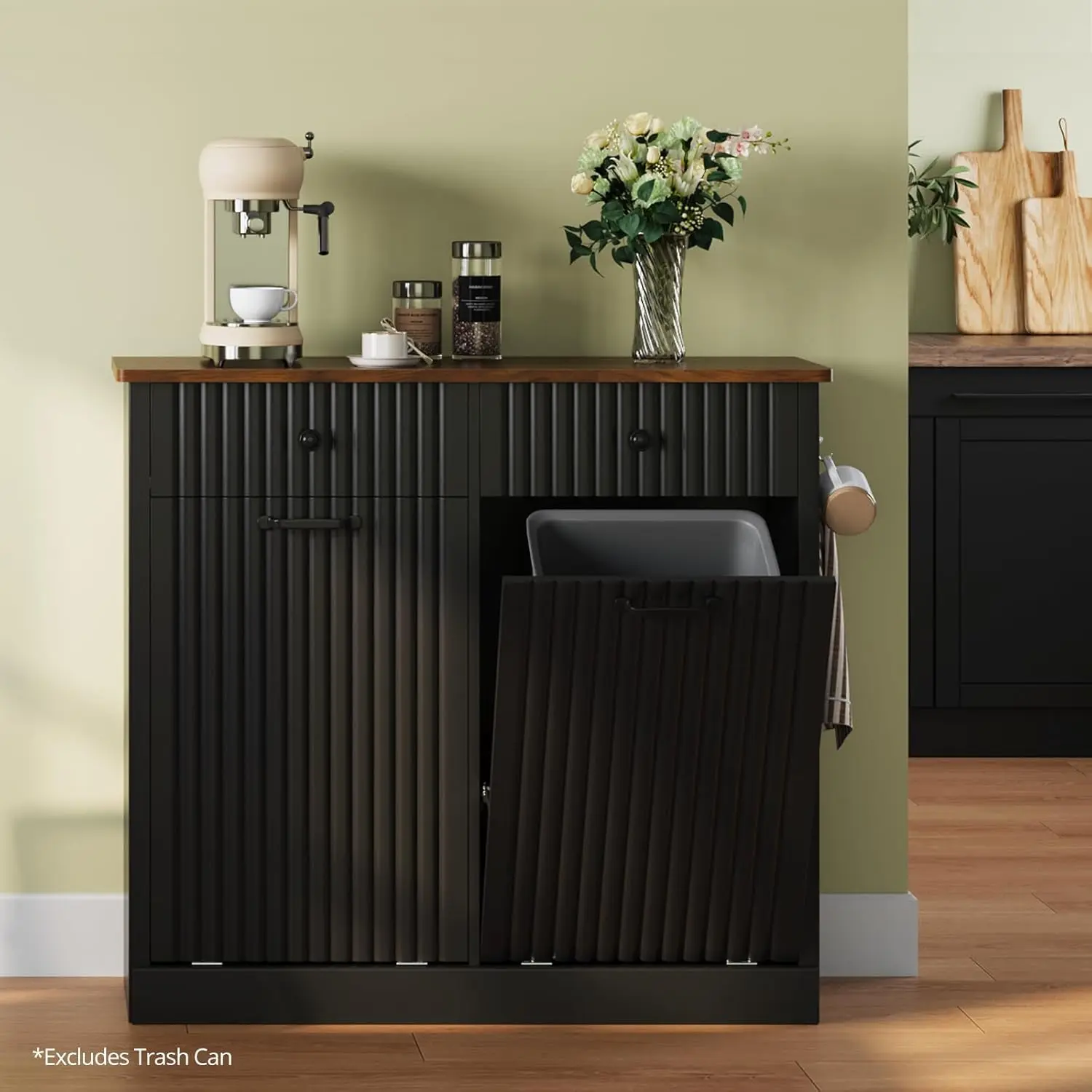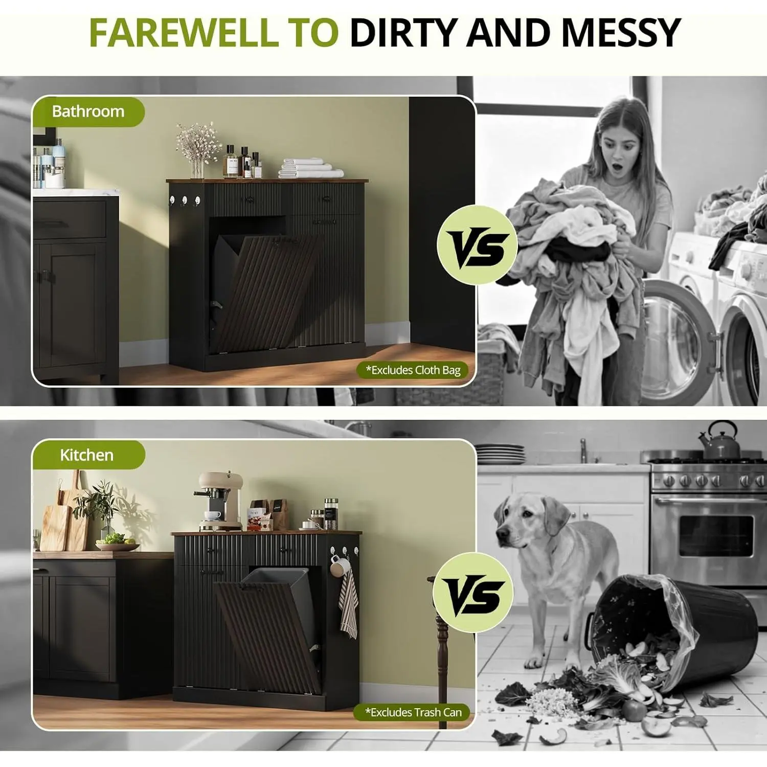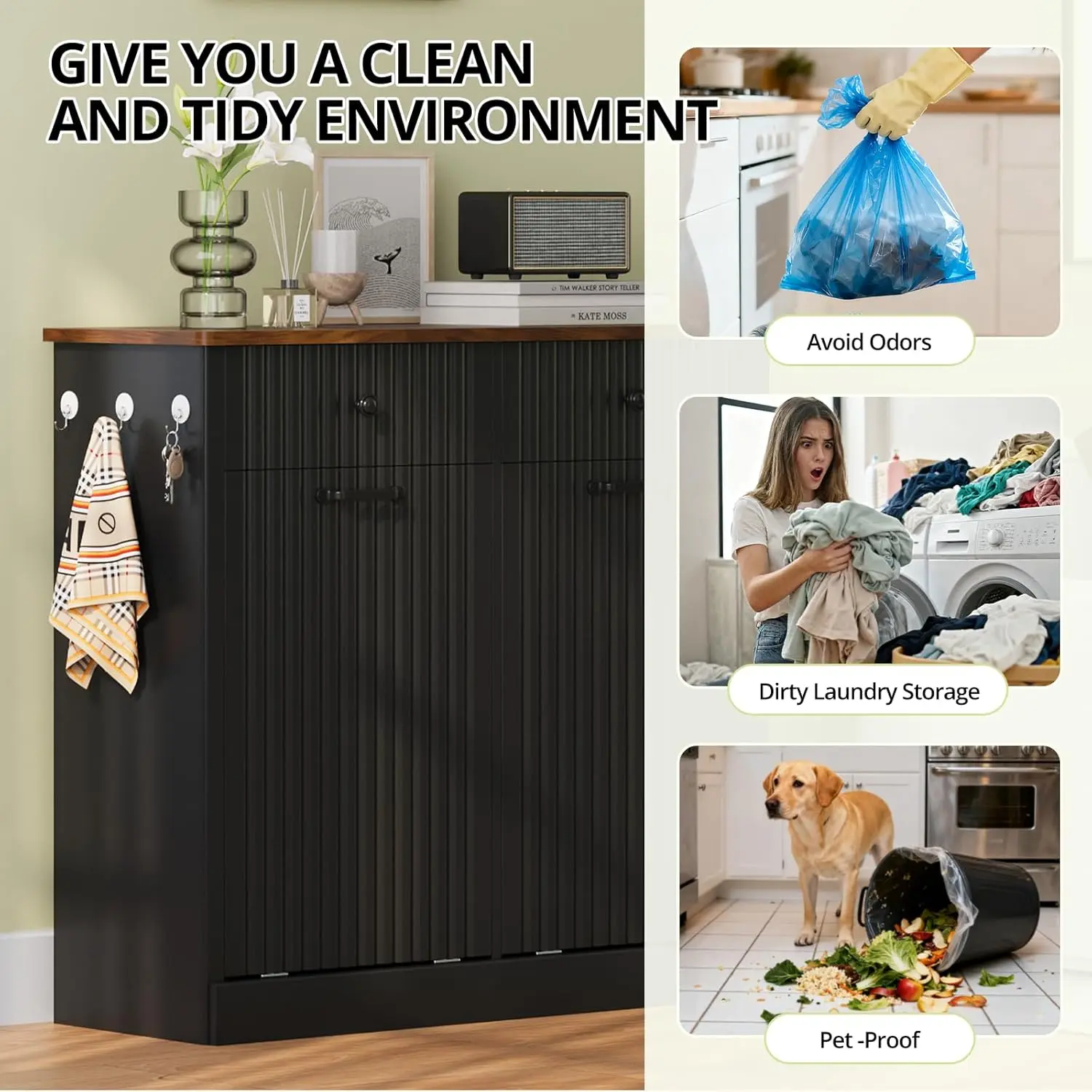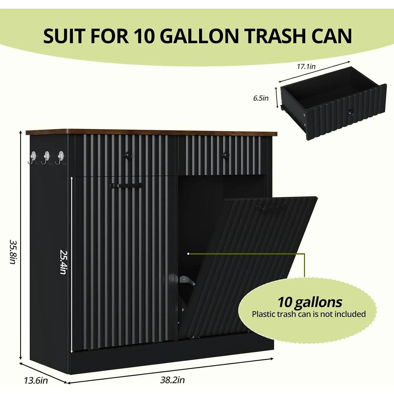 [Tilt Out Trash Can Cabinet]: 38.2"W*13.6"D*35.8"H double tilt-out trash cabinet fits two 10-gallon bins or 2 laundry basket.Conceals trash without extra space to keep kitchens tidy, blocks access from kids/pets, and traps odors for fresh indoor air.(Note: Without Trash Bin or Laundry Hamper)