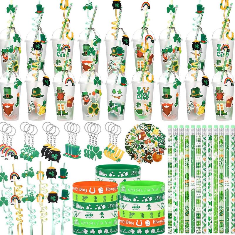 Includes 24 reusable cups with dome lids, 24 reusable plastic straws, 24 straw decorations, 24 keychains, 24 silicone bracelets, 24 pencils, and 50 stickers. Perfect for classroom gifts, party favors, and giveaways.
