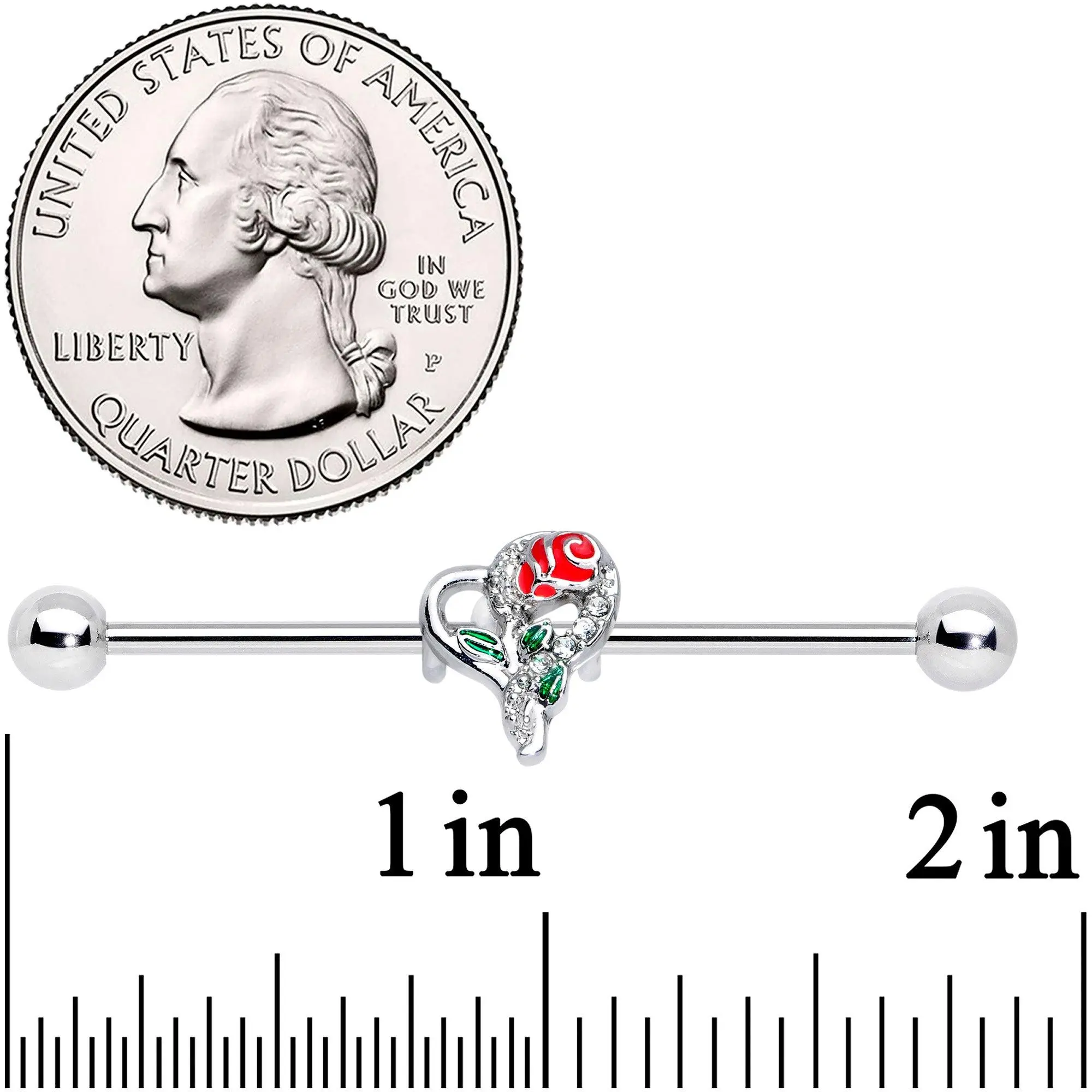 If you have an open heart, you'll be sure to welcome this 14 gauge helix barbell into your jewelry wardrobe! It's made with a 1 1/2" durable 316L surgical grade stainless steel straight barbell with 5mm ball ends and features a heart charm with one side lined with clear gems. The heart twines around a red and green rose. It's the perfect look for both the hopeless romantic and celebrating Valentine's Day. You can even slide the charm up and down the barbell to get just the look you're after. This barbell earring is sure to win your heart!Specifications14 Gauge (1.6mm), 1 1/2" (38mm), 316L Surgical Grade Stainless Steel Straight Barbell, 5mm Ball Ends, Moveable Charm