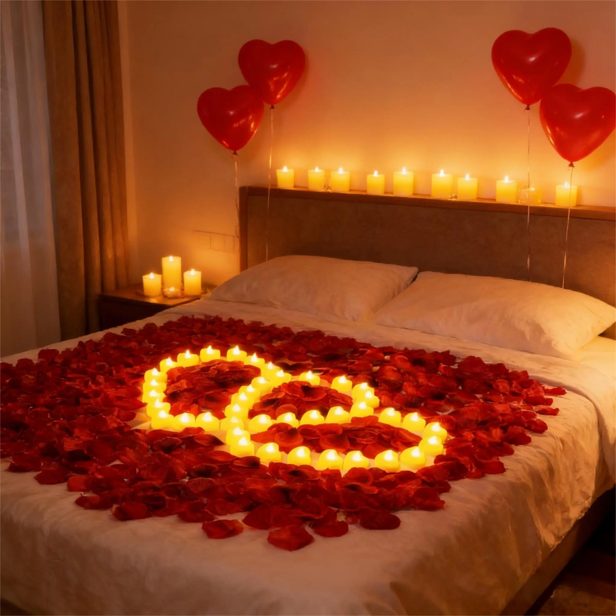 This kit features 1000 artificial rose petals, 30 burgundy heart balloons, and 24 LED tea lights. Perfect for Valentine's Day, weddings, anniversaries, and Halloween. These elements add charm to any setting. 🎉
