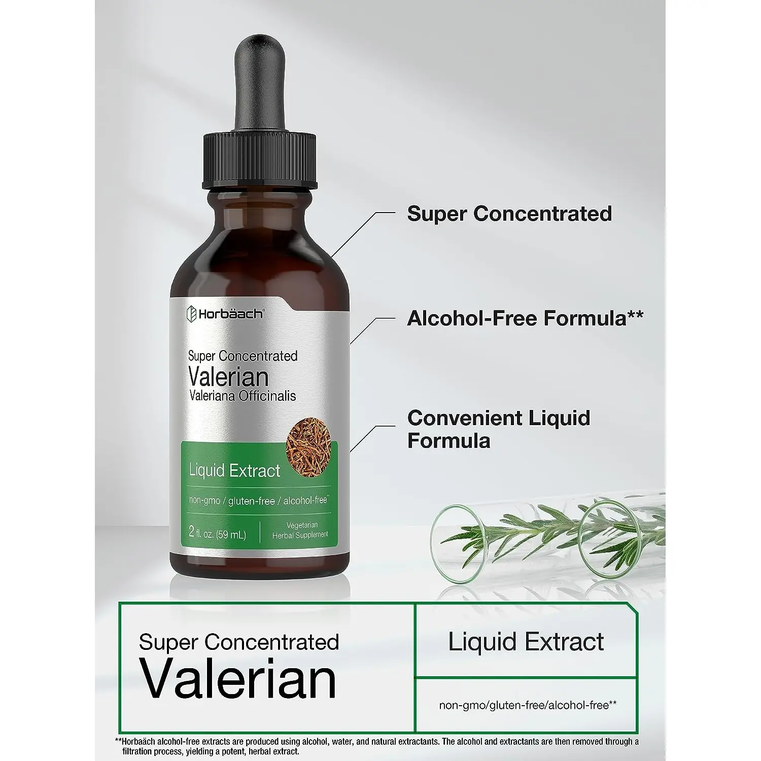 Horbäach alcohol-free extracts are produced using alcohol, water, and natural extractants. The alcohol and extractants are then removed through a filtration process, yielding a potent, herbal extract.