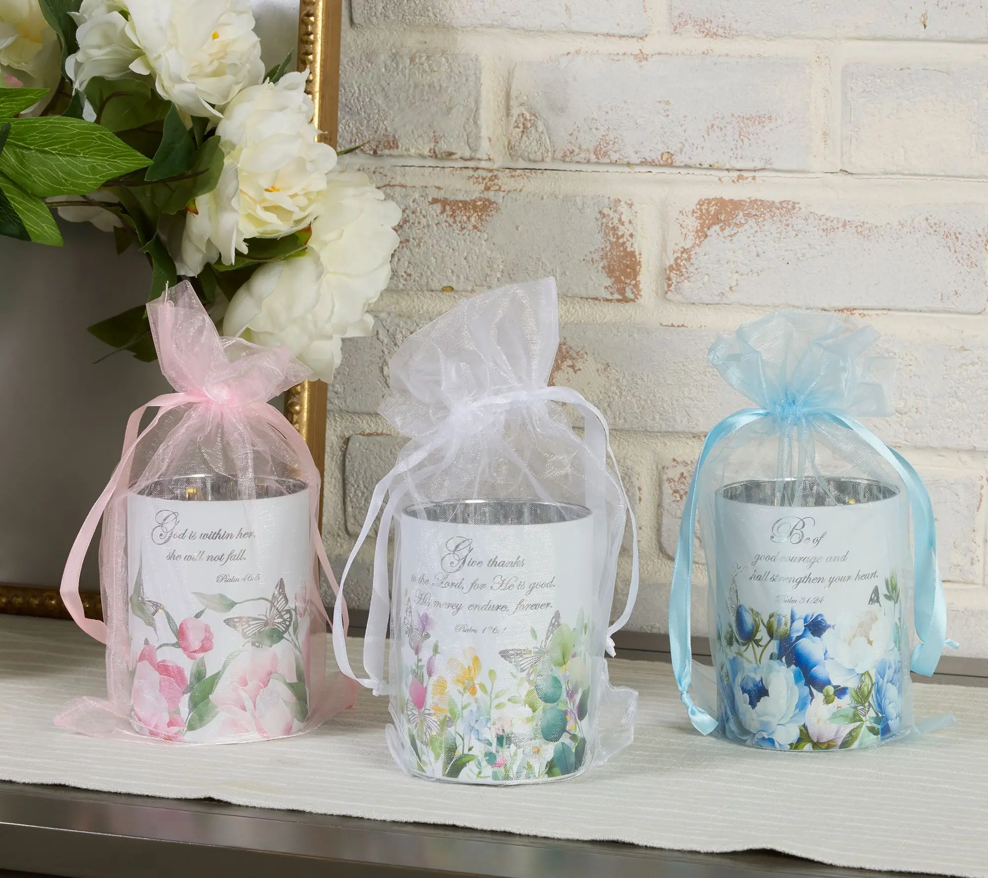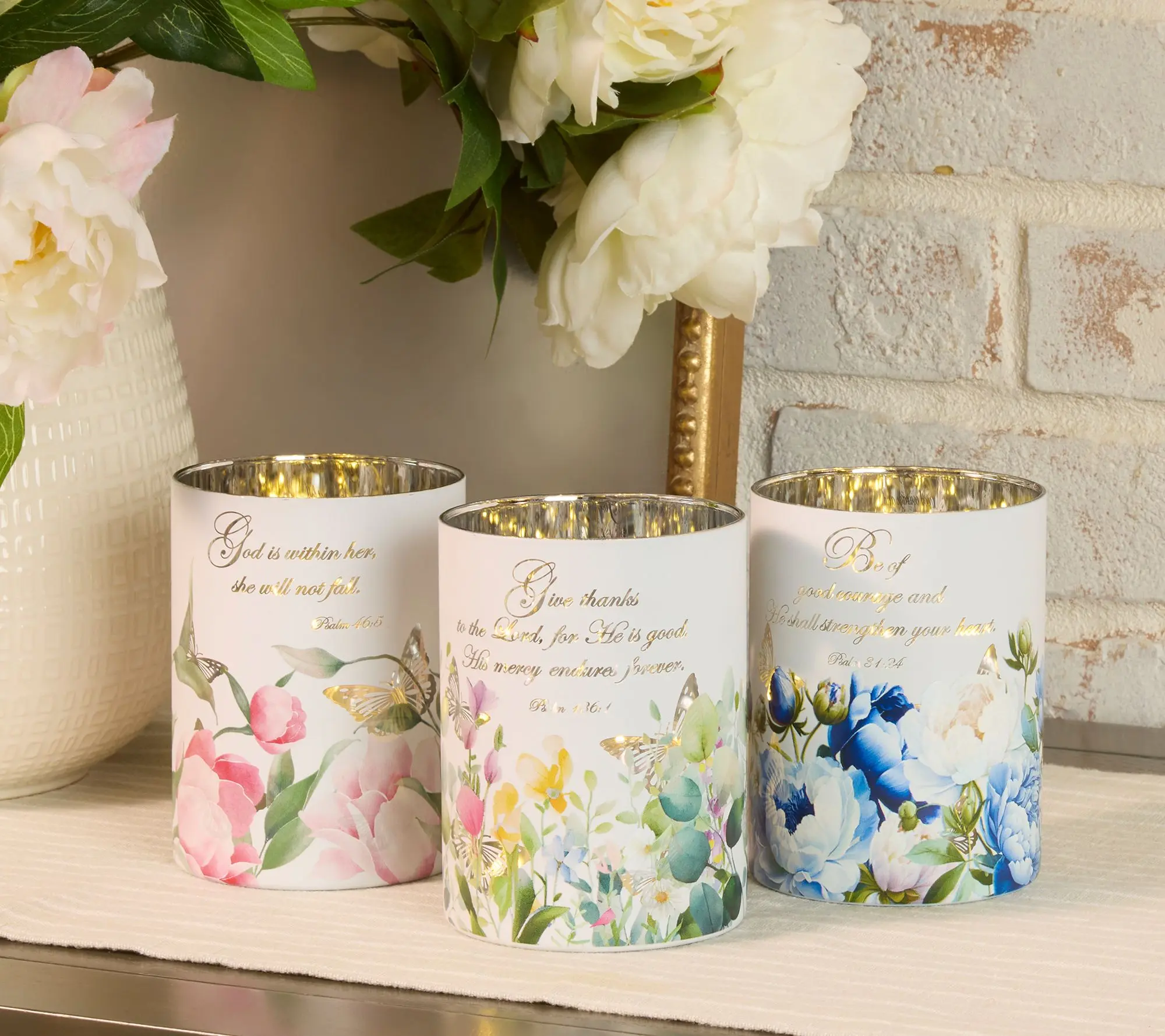 S/3 Illuminated Prayer Garden Hurricane with Sheer Bags by Valerie @QVC, Inc #prayer #homedecorfinds #prayergarden #illuminated #springdecor