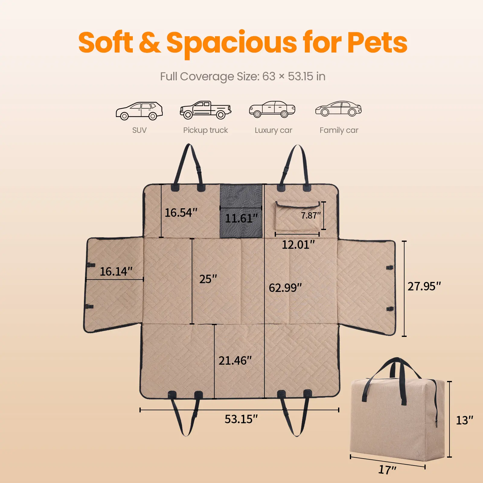 Designed with four-sided coverage to fully protect your back seat from dirt, hair, and scratches. The bottom features three built-in support panels that help create a stable, flat surface and prevent sagging—especially suitable for larger dogs.