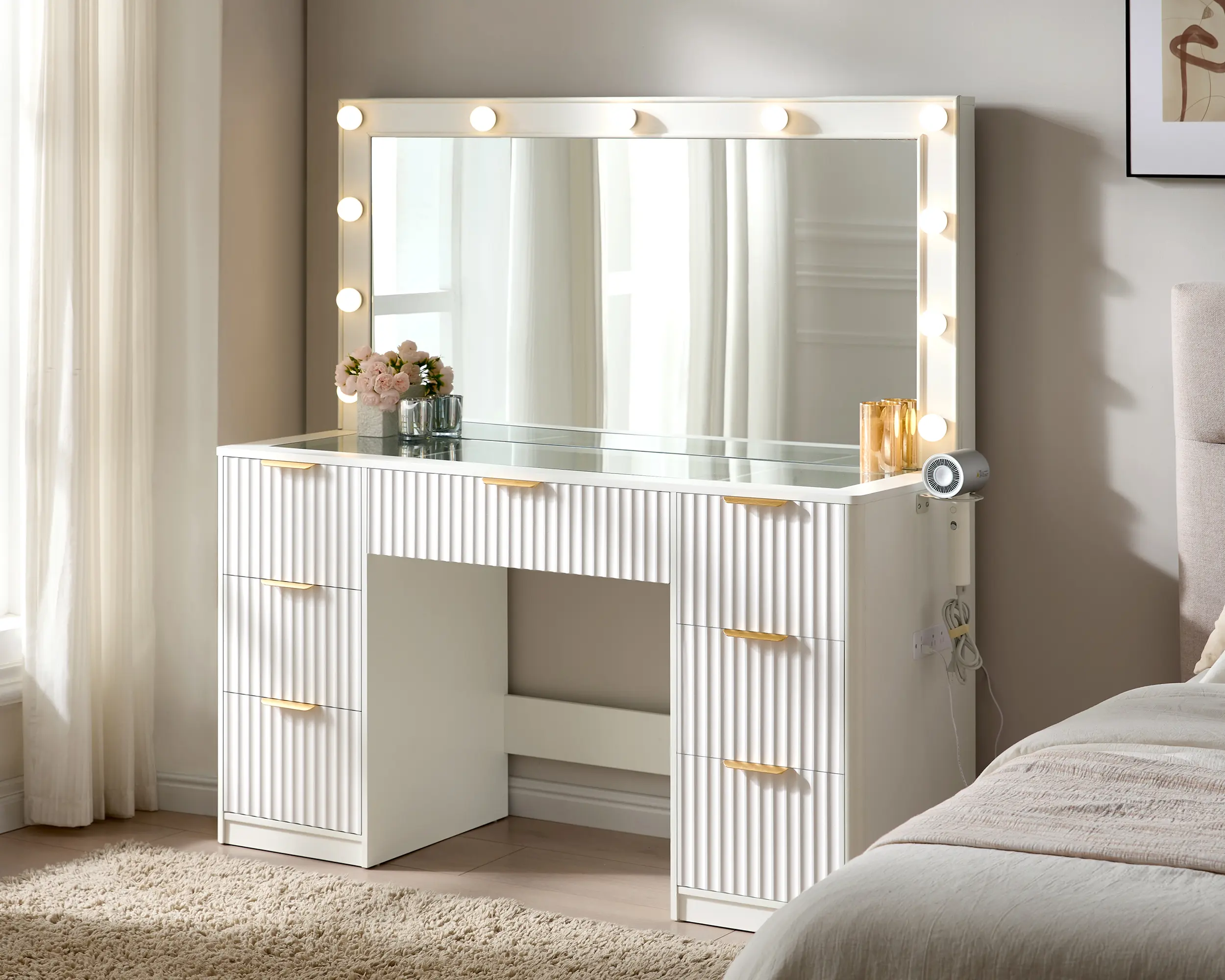 ·【All-in-One Makeup Vanity Desk】 This multifunctional vanity table integrates a tri-tone lighted mirror with stepless dimming, spacious drawers, built-in charging ports, and a hair dryer holder for a seamless beauty experience.