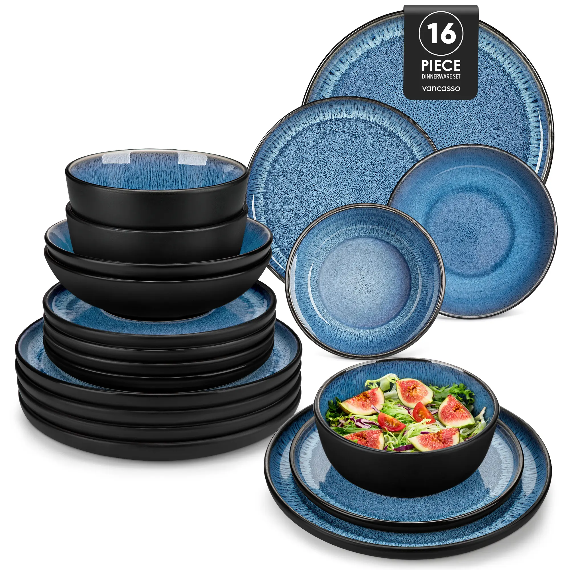 vancasso playa blue dinner set's inspired by the shades of blue of Mediterranean landscap, reflects the vibrant and rustic aesthetics of Mediterranean culture. The natural reaction glaze formed by high-temperature firing of stoneware, enhancing their visual appeal. The ingenious combination of practicality with artistic flair, bring you the lively and eclectic style of Mediterranean dining.
