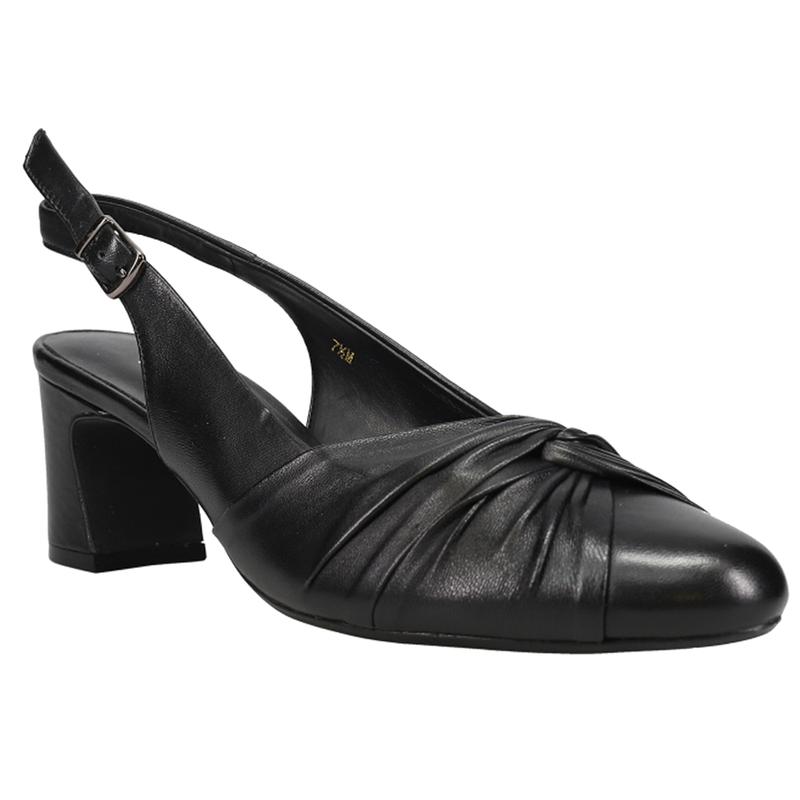 Slingback pump featuring a twisted material design and buckle closure for an adjustable fit. Flexible rubber bottom, softly padded insole, and a 2.5 inch heel.