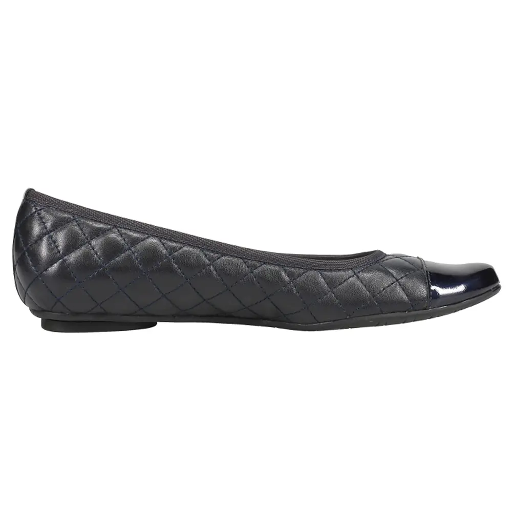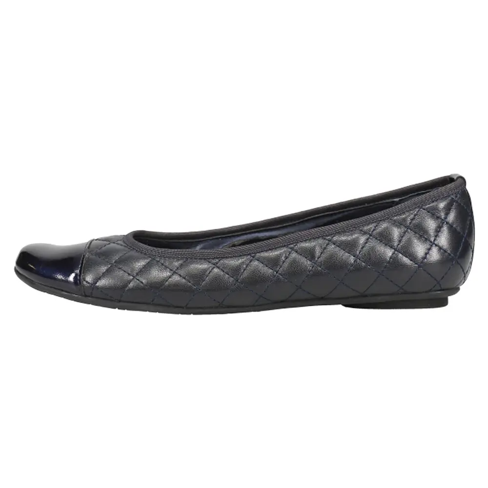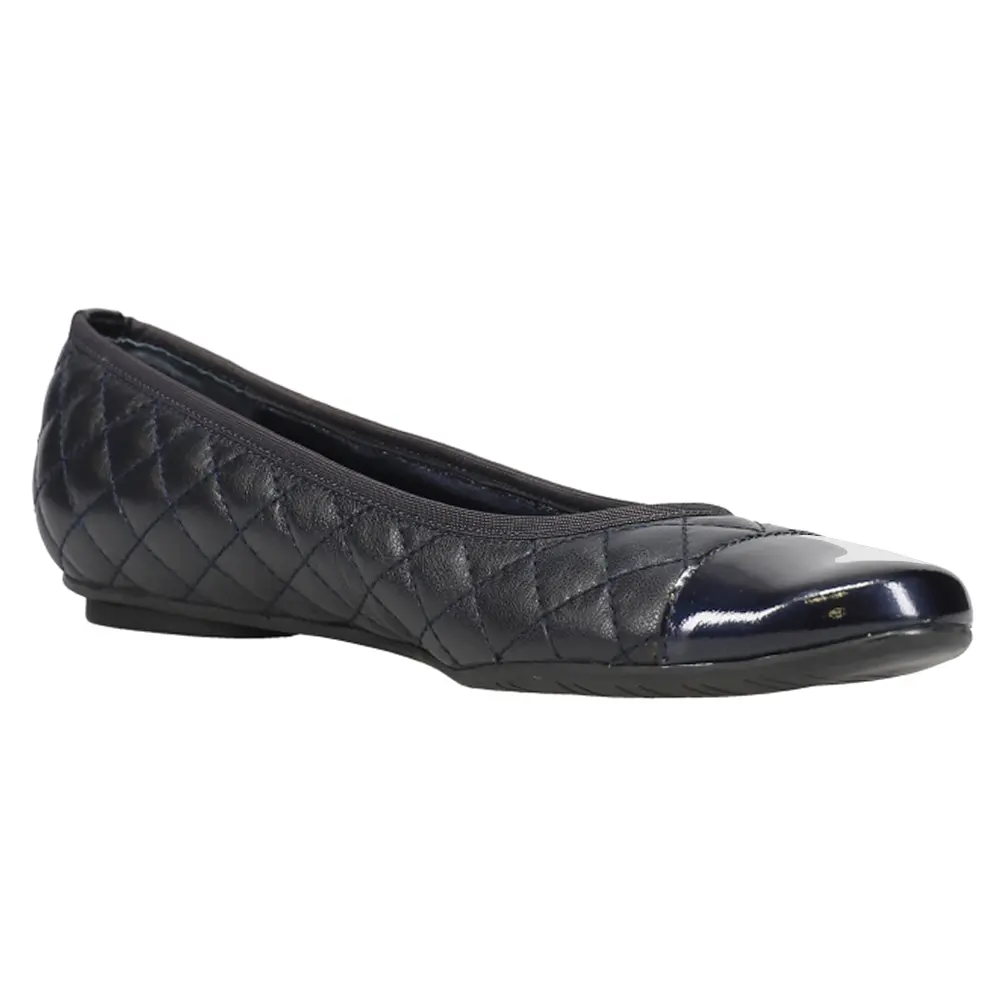 Find serenity and style this season in the Serene flat from Vaneli with fashionable quilt stitching and patent leather accent at the toe. Combination leather and textile interior helps to wick away unhealthy moisture.