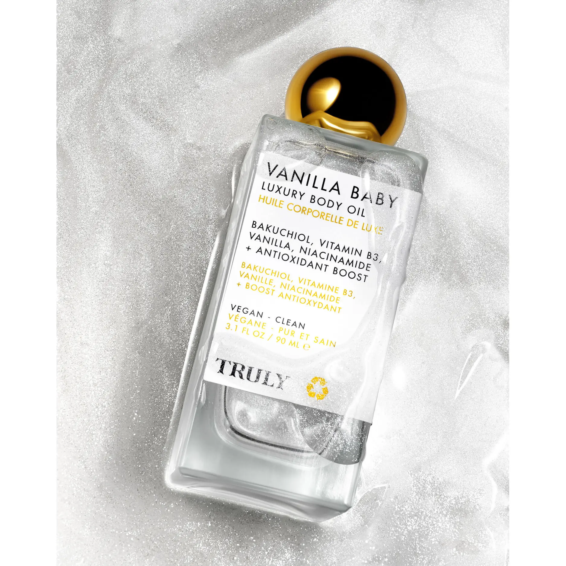 ·Vanilla Baby Body Oil visibly firms and illuminates skin with a stunning pearlescent shimmer.