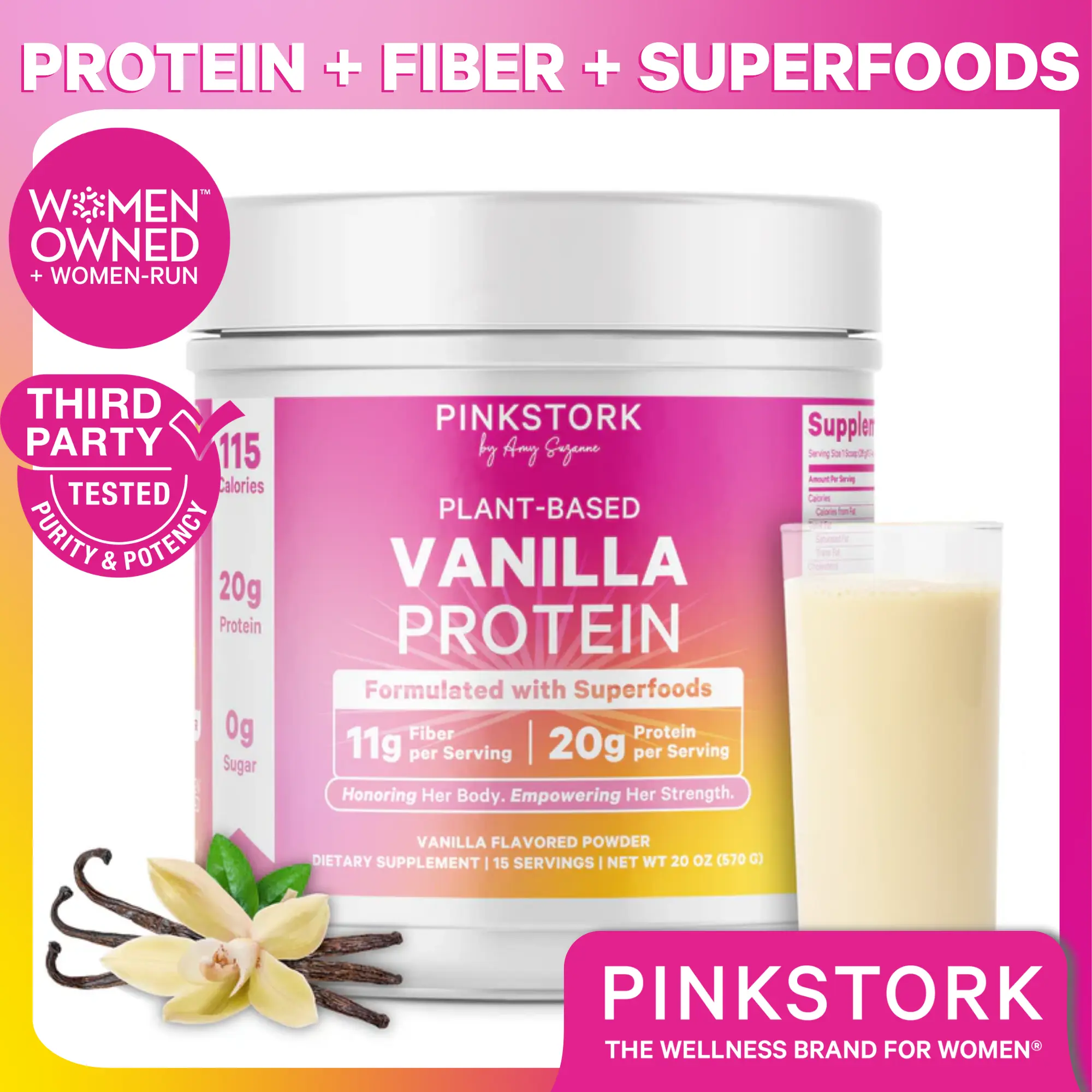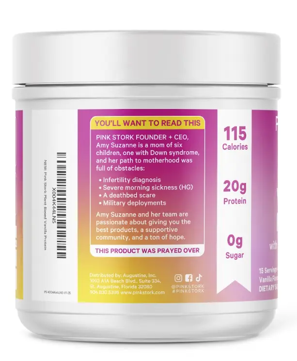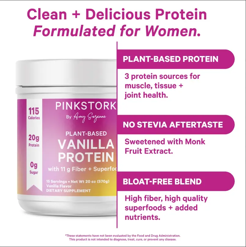 Pink Stork's Vanilla Protein is vegan, non-GMO, gluten-free, sugar-free, dairy-free, and gelatin-free. Each product is cGMP-certified and third-party tested for quality. Trust in the best for your health. Women-Owned, Women-Run, empowering women through holistic wellness.