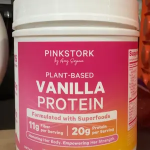 Pink Stork Vanilla Protein Powder offers 20g of plant-based protein per serving. It includes pea, brown rice, and soy proteins. This supports healthy muscles and provides caloric intake. Each container contains 15 servings. Perfect for pre-workout fuel or daily energy boost.