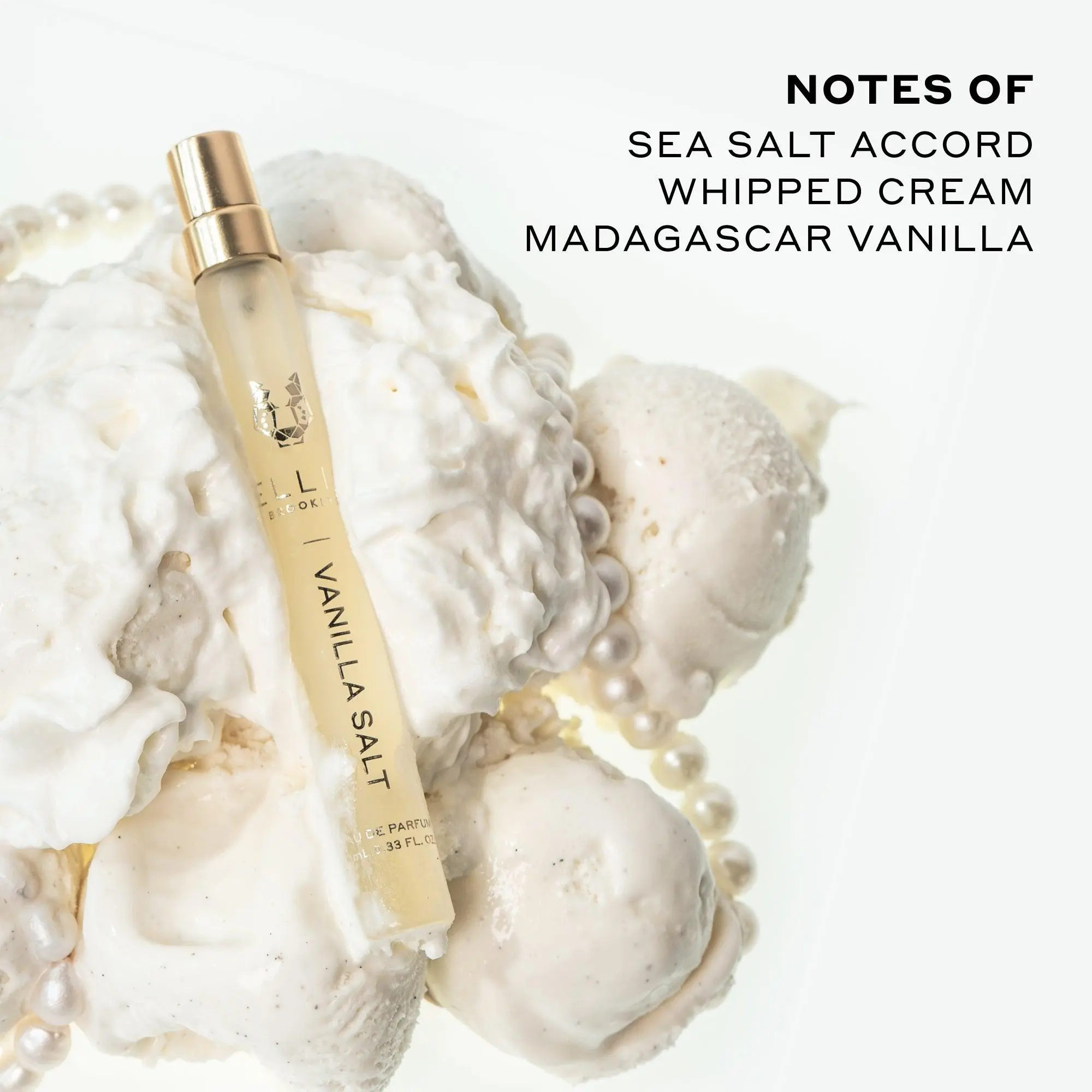 Sweet, vanilla, powdery, salty, aquatic, marine, yellow floral, warm, woody, musky, feminine, sensual, seductive, chic, elegant, classy, charming, whimsical, enchanting, delicate, dreamy, delightful, alluring, tempting, addictive, captivating, radiant, luminous, ethereal, sophisticated, inviting, cozy, comforting, gourmand, a bit savory, intriguing, unique