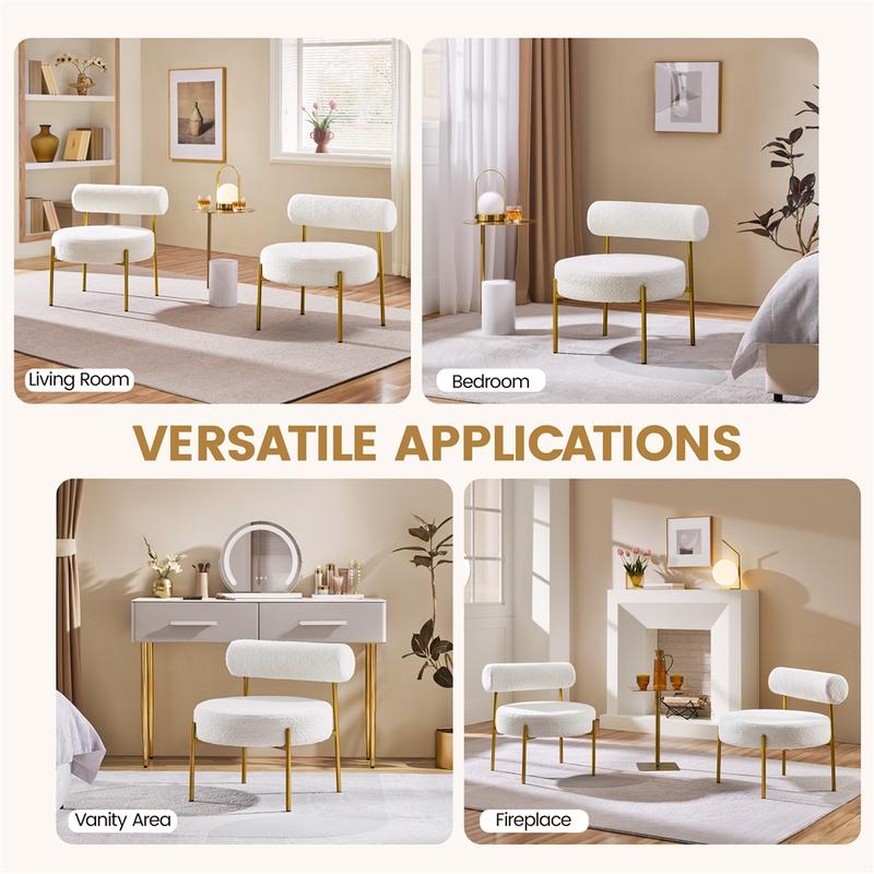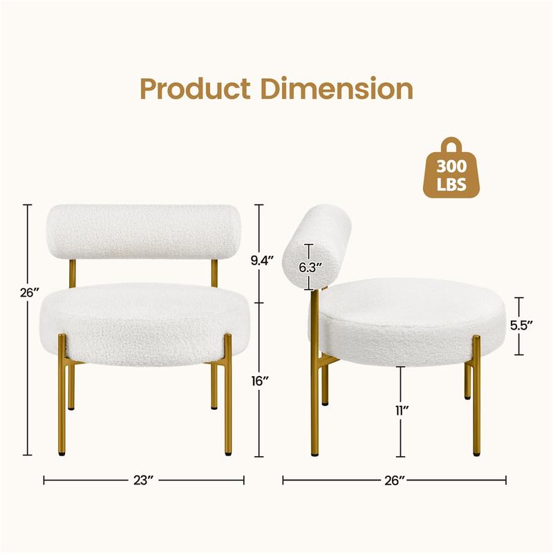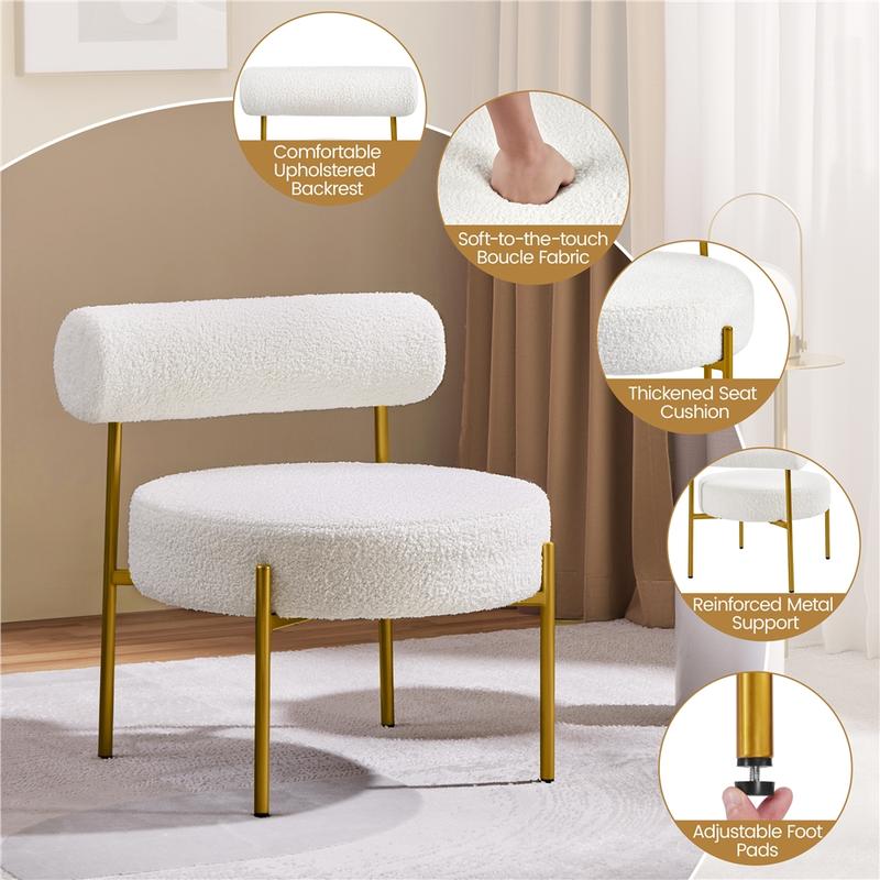 Create a soothing and welcoming living space with this stylish boucle accent chair. This armless side chair embraces a bold circular seat, cylindrical backrest, and slim gold-finish legs for a unique contemporary look in your home. This upholstered accent chair is built of long-wearing polyester boucle, solid metal legs, and high-density foam. Its roomy round seat provides a comfortable place to sit, and the padded back allows you to settle back and relax. The boucle upholstery is soft to the touch and keeps you warm in cold days, adding texture and elegance to your home. Whether used in the living room, bedroom, home office, or lounge of your house or apartment, it will instantly become a focal point and grab lots of compliments from guests.