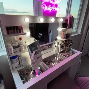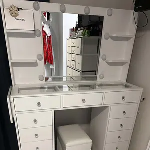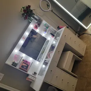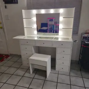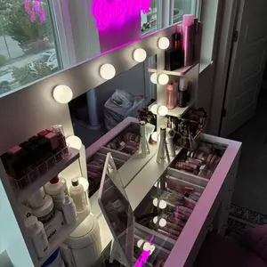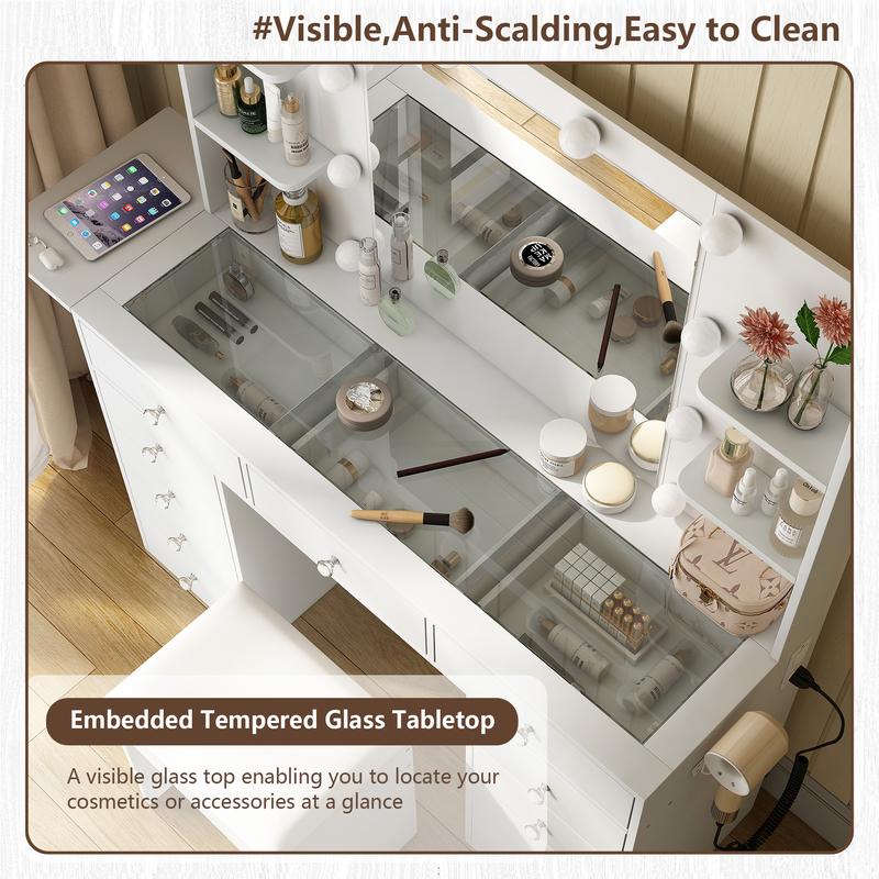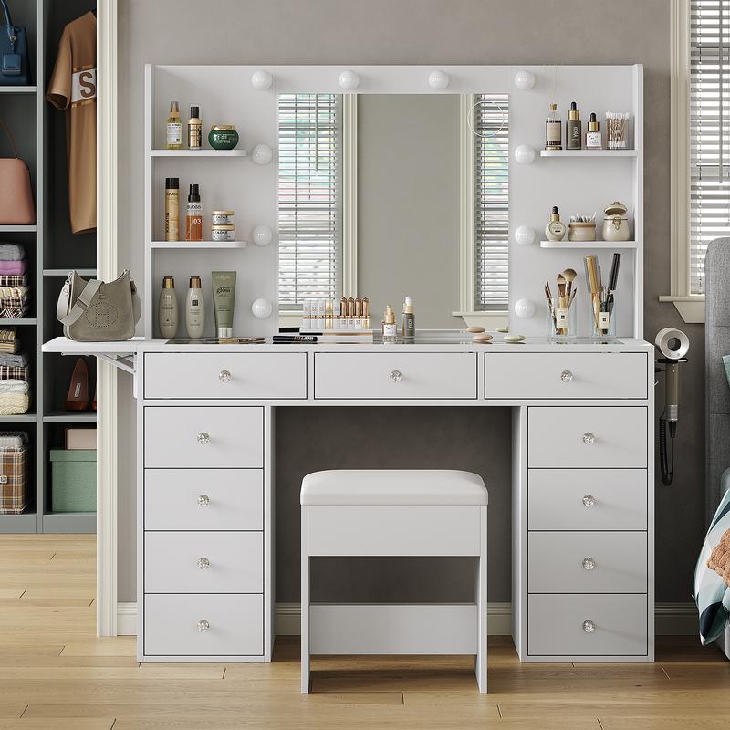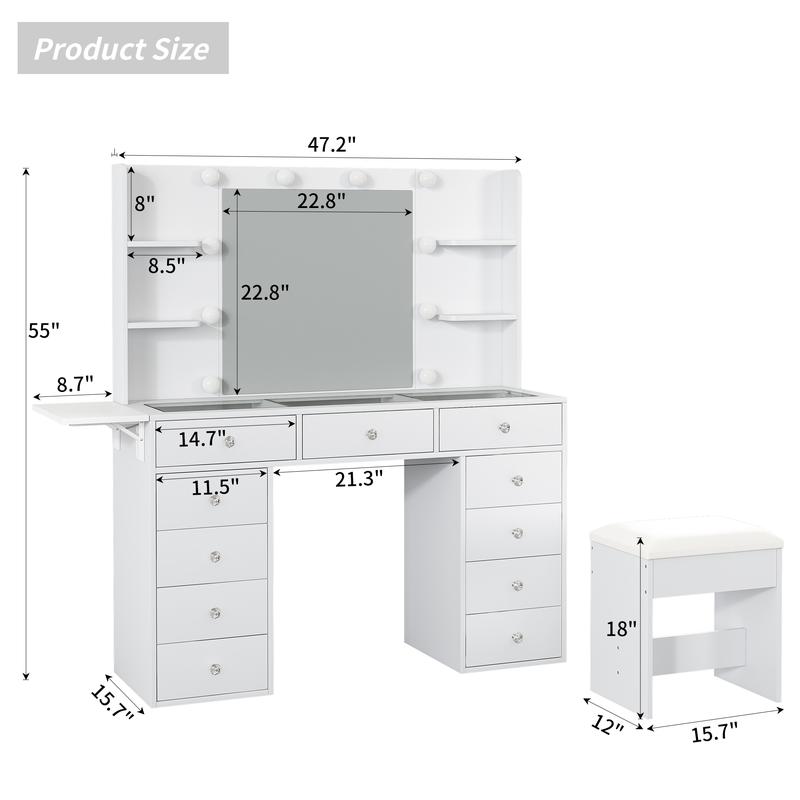 3 Lighting Modes & Brightness Adjustable: The vanity desk is equipped with an HD mirror and 10 bright Hollywood plastic bulbs, provides 3 color modes (warm/natural/cool) and adjustable brightness, this makeup vanity can meet all your different needs, perfect for home makeup, salon, and live broadcast., so you can experience the star-like makeup treatment