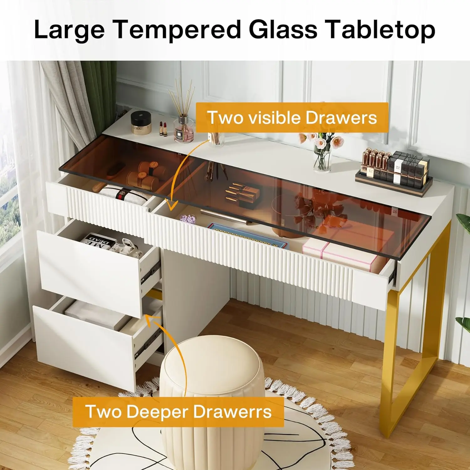 2. Transparent Glass Tabletop: This makeup vanity features a large tempered glass desktop for additional storage space for decor accents. The transparency of the glass offers visibility to items stored in drawers for easy access.