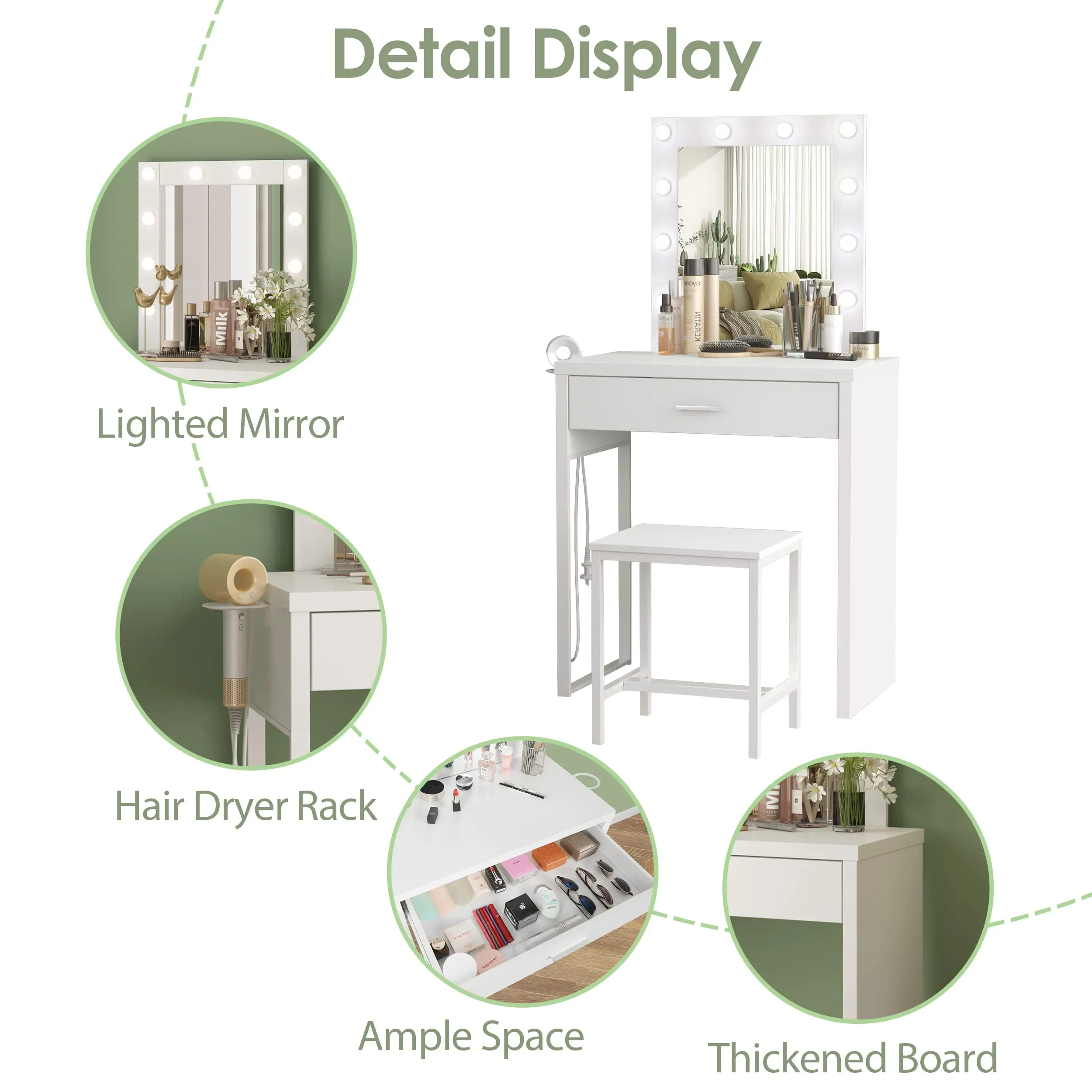 Package Content: 1 Dressing Table, 1* Stool, 10* LED Bulbs, 1* Screw Bag, 1* Instruction.