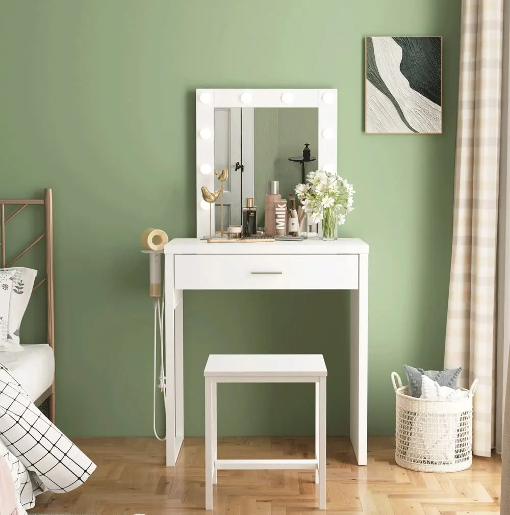 Vabches Vanity comes with high quality dimmable LED lights, which are insanely bright, and easy to adjust the brightness. Whether it's day or night, you can always see your eye shadow and eyeliner clearly.