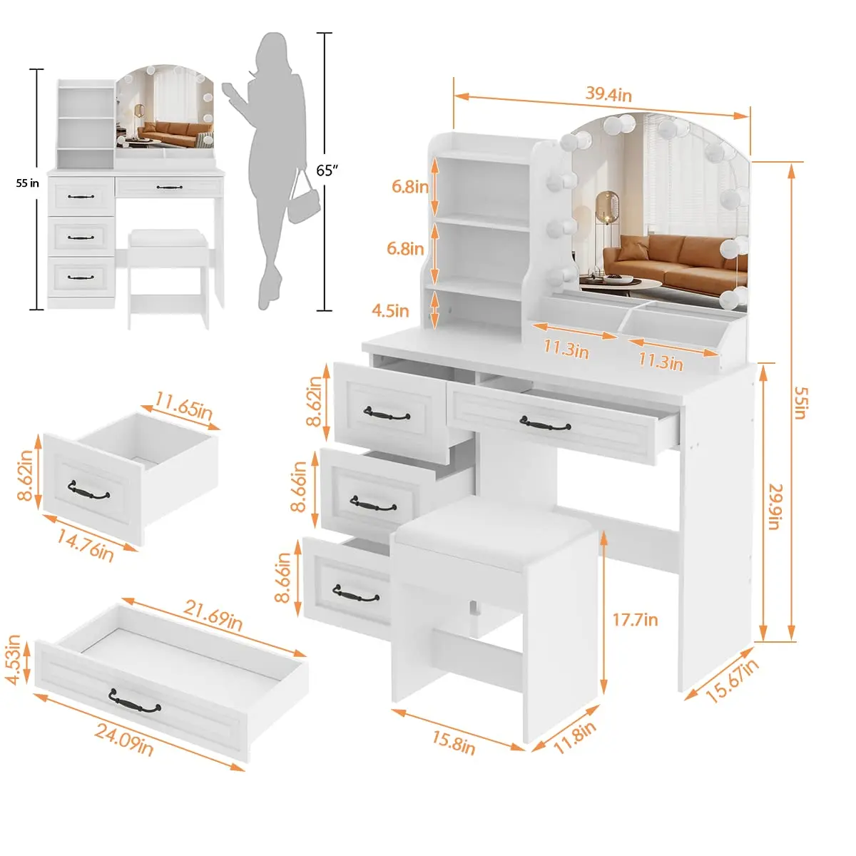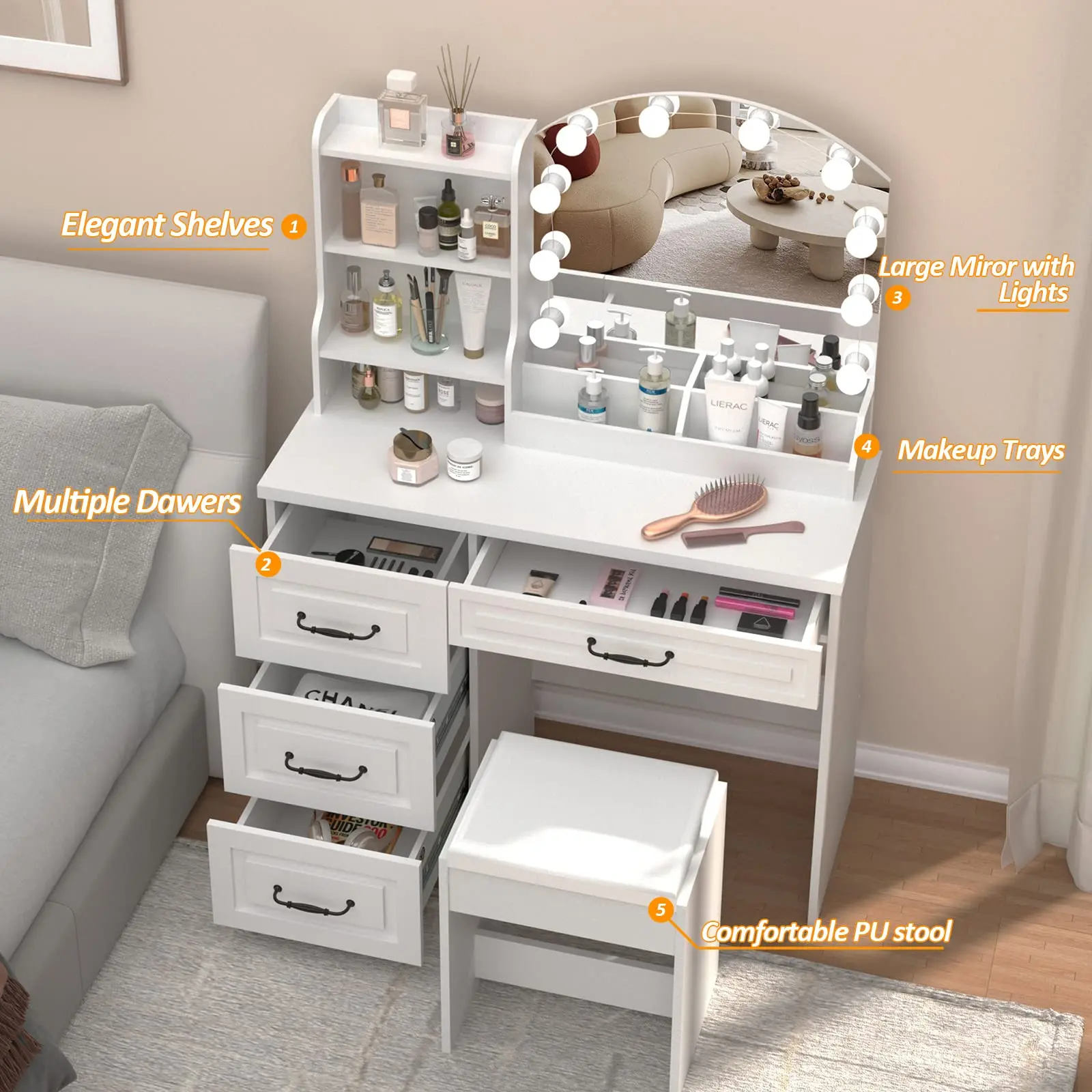 Upgrade design with 4 makeup trays, 4 larger drawers with retro handles, 3 shelves for more storage space, and extra large and comfortable stool, make your daily grooming more convenient and happy!