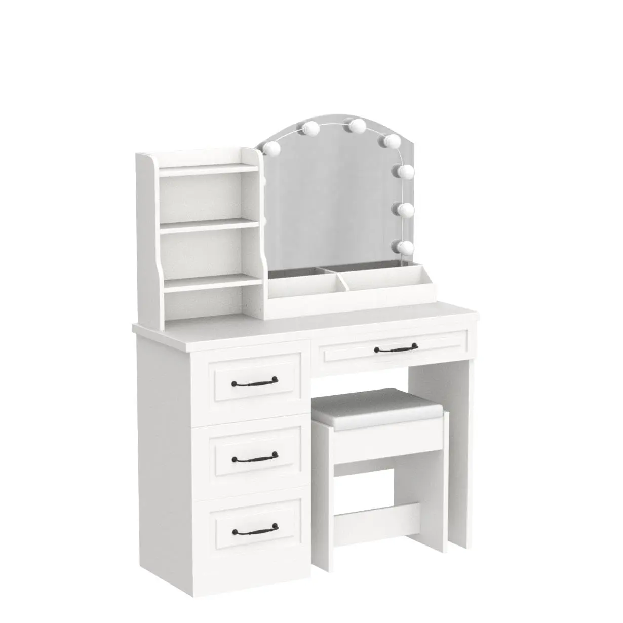 Package ContentïŒ1 x Dressing Table, 1 x Cushioned Stool, 10 x LED Bulbs, 1 x Accessories, 1 x Instruction.