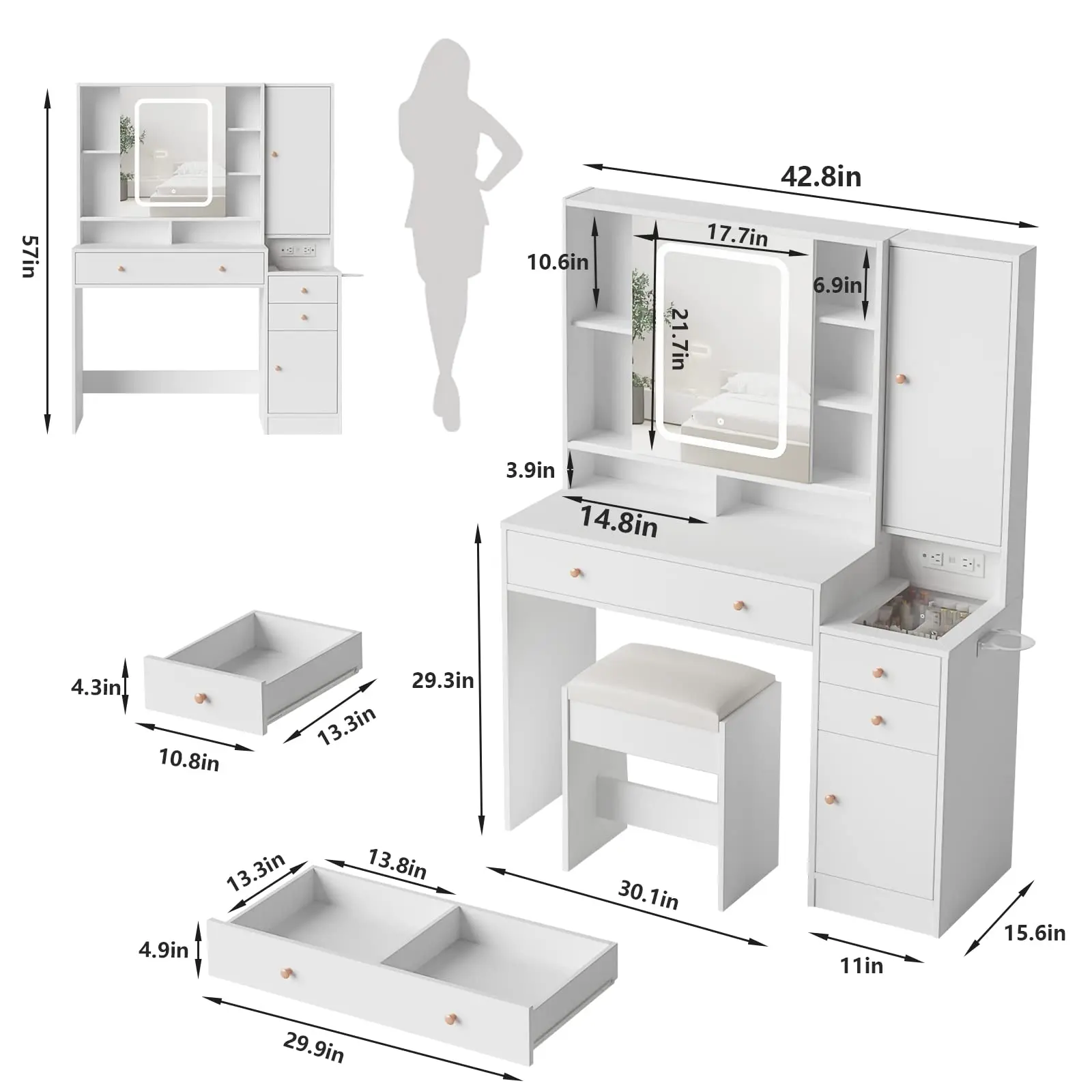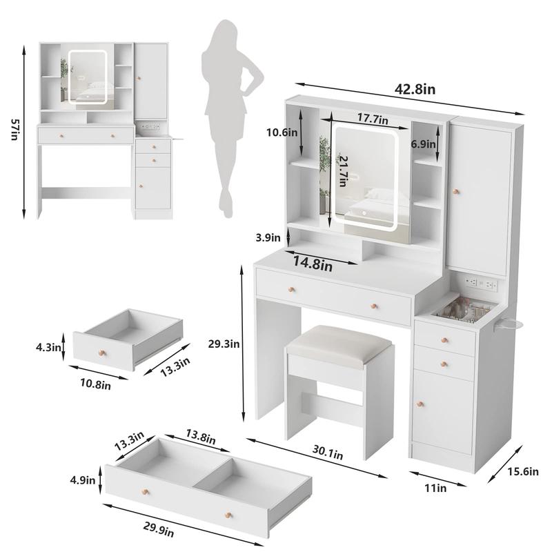 ·Perfect size makeup vanity with lots drawers: 42.8(W)*15.6(D)*57(H)in.