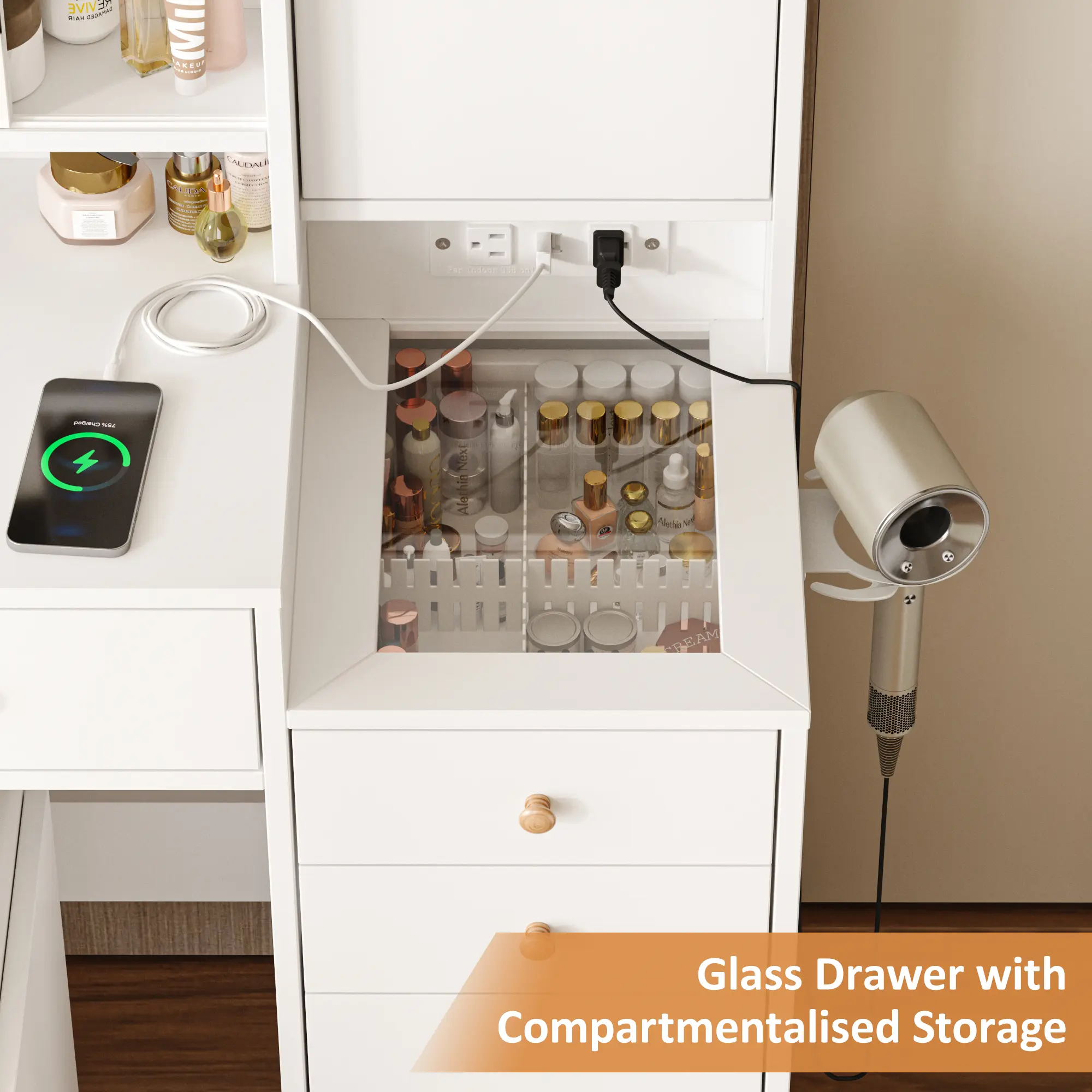 ·The glass top drawer, make this vanity more cute and convenient.