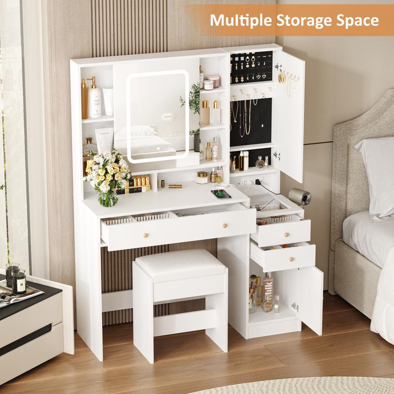 ·【Functional 2-in-1 Design】Super Large Capacity, this make up vanity is a perfect combination of vanity and jewelry armoire. Constructed with lots storage shelves, 3 drawers, and 2 cabinets, can easily store all of your cosmetics and jewelry. A big surprise for her on birthdays, Valentine's Day, Mother's Day or other anniversaries.