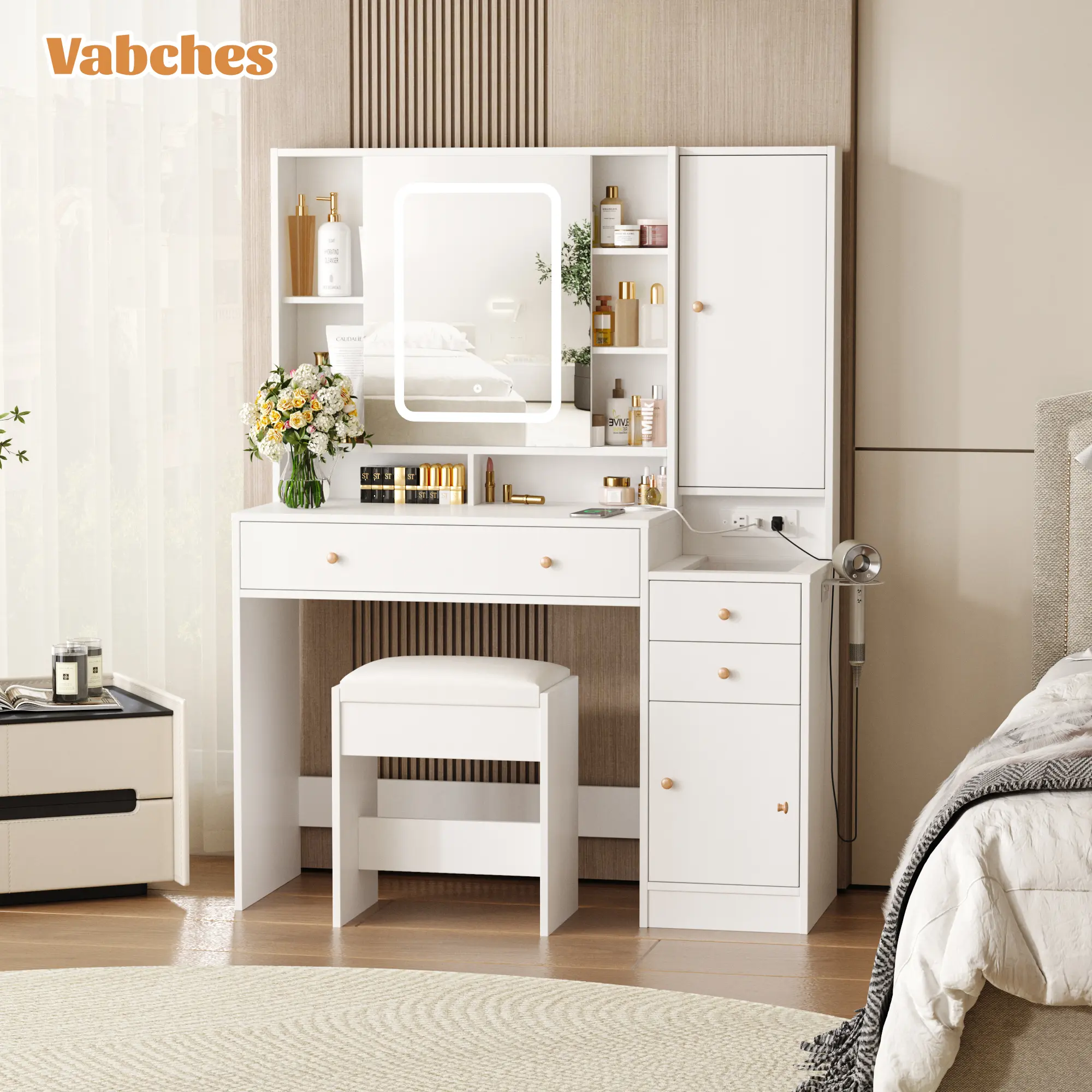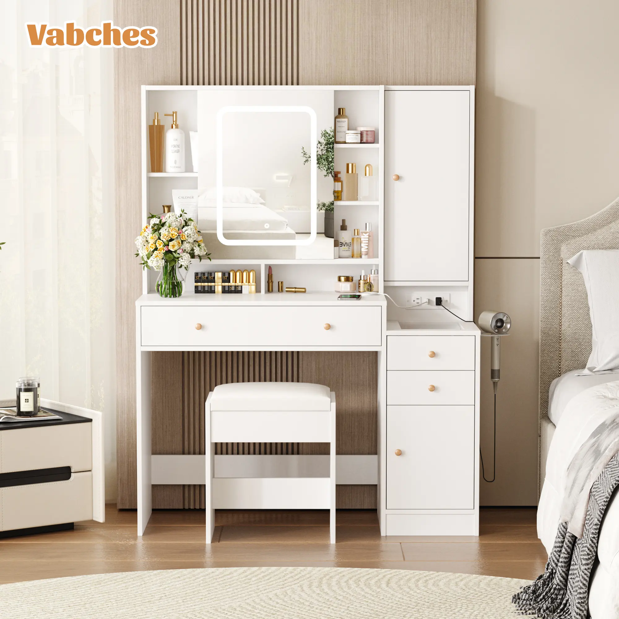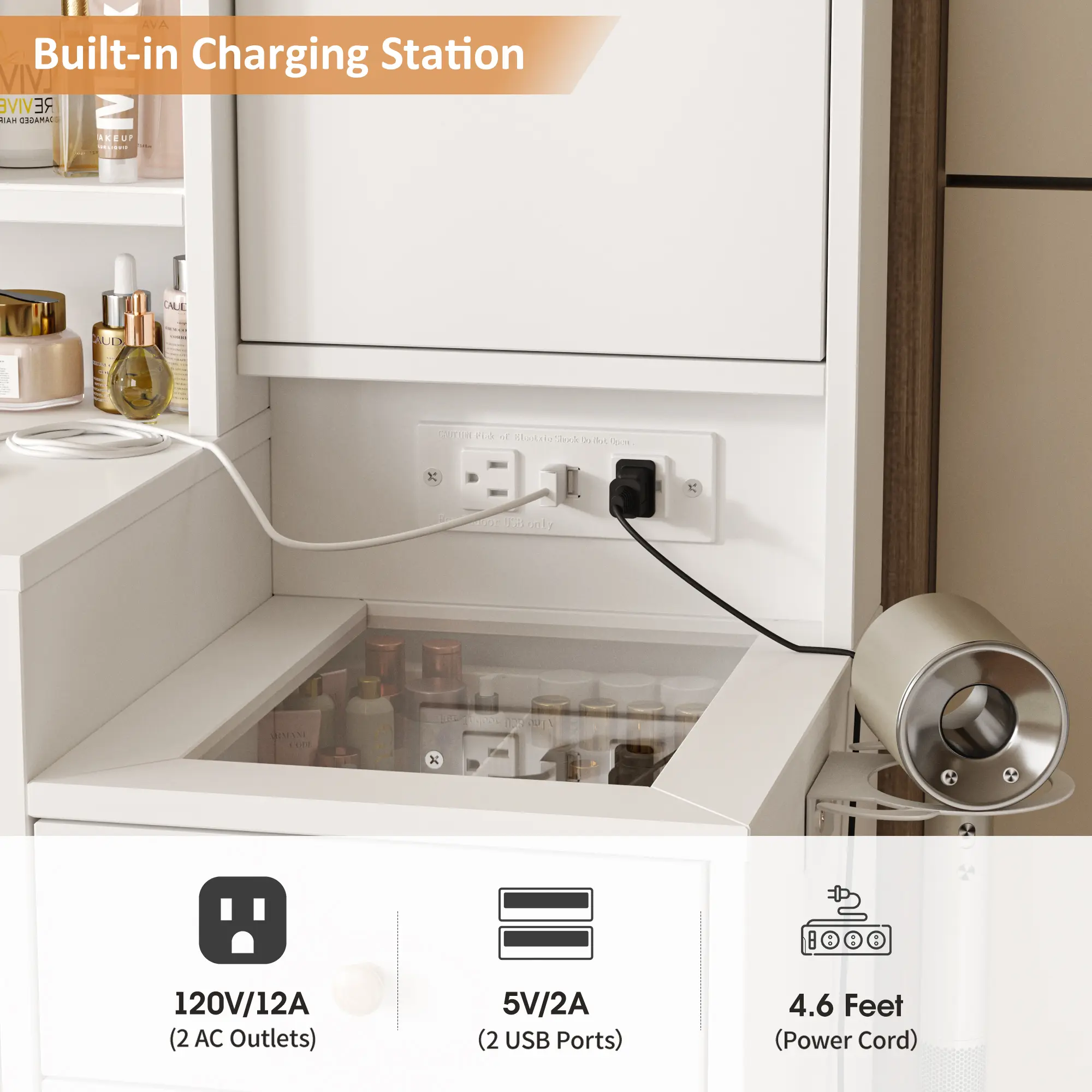 ·【Built-in Charging Station】Upgrade design with convenient hair dryer rack and power outlet. This vanity table add 2 standard plug sockets and 2 USB ports, you can easily use hair dryer, curling iron in front the mirror, and charge your phone or other mobile devices during makeup. Nice vanity set for dressing room, salon or live broadcast.