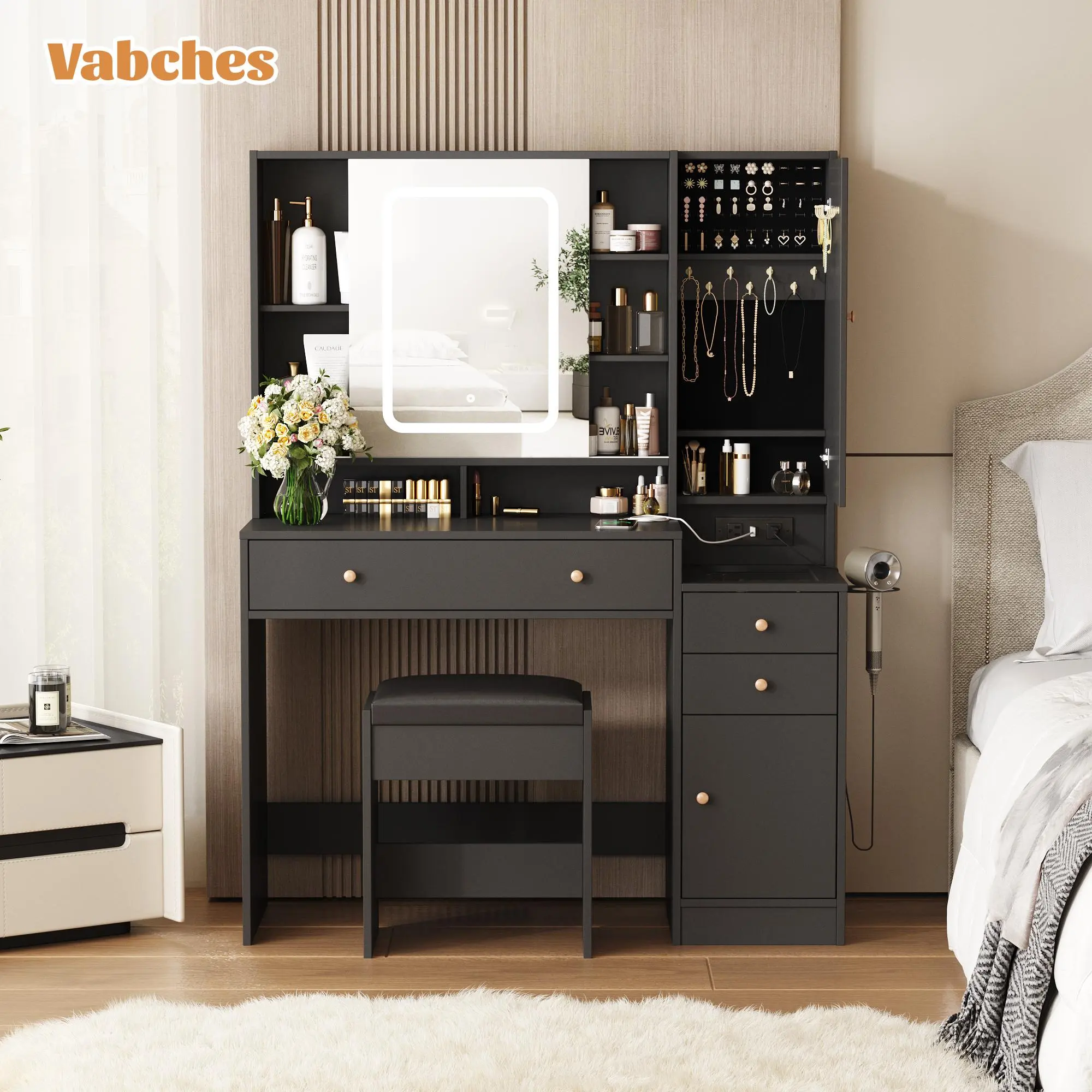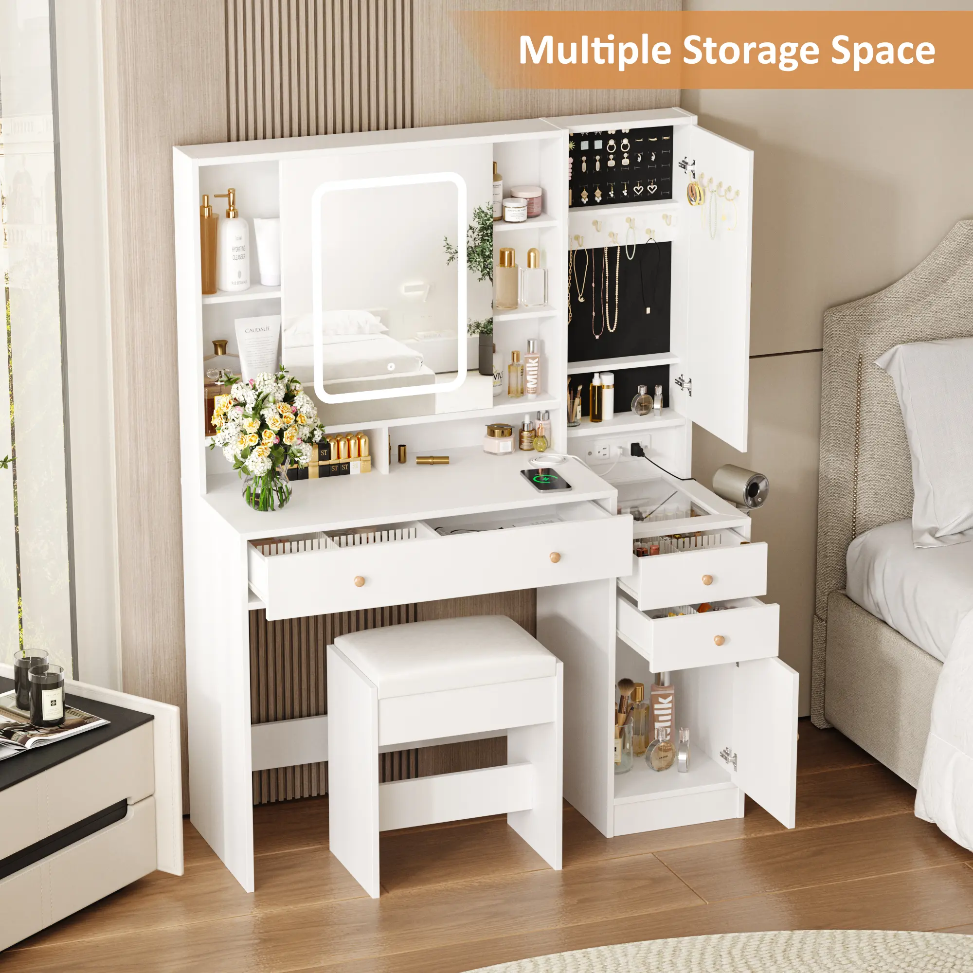 ·Functional 2-in-1 Design. Super Large Capacity, this make up vanity is a perfect combination of vanity and jewelry armoire.