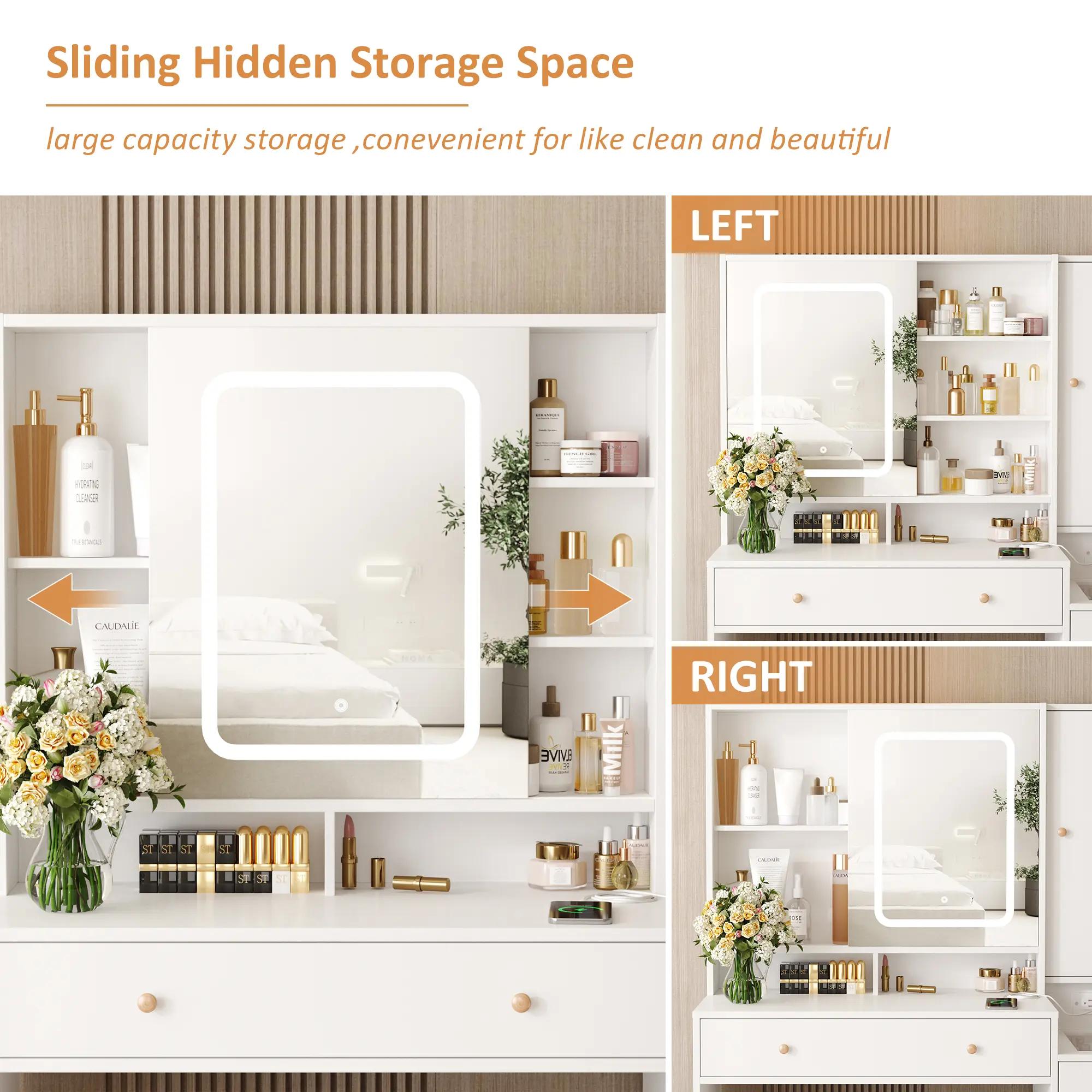 ·Constructed with lots storage shelves, 3 drawers, and 2 cabinets, can easily store all of your cosmetics and jewelry.