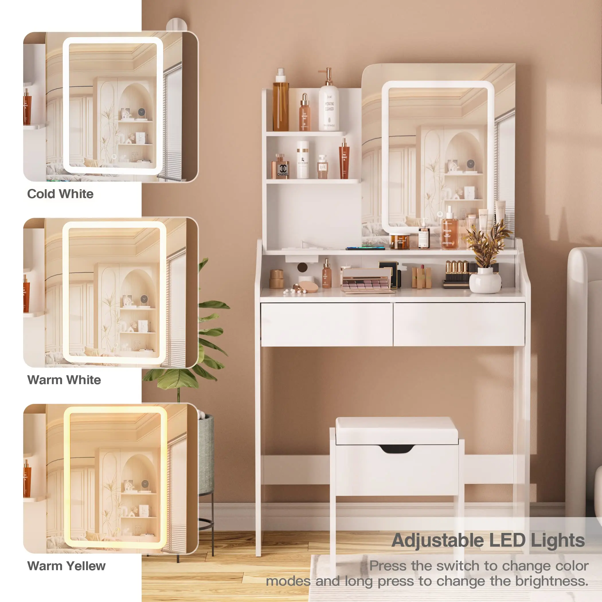 Hollywood Vanity Light: Our dressing table has stylish LED lights with 3 different color lighting modes: warm yellow, warm white and cool white. You can easily change the color mode by touching the switch, or adjust the brightness by pressing and holding the switch