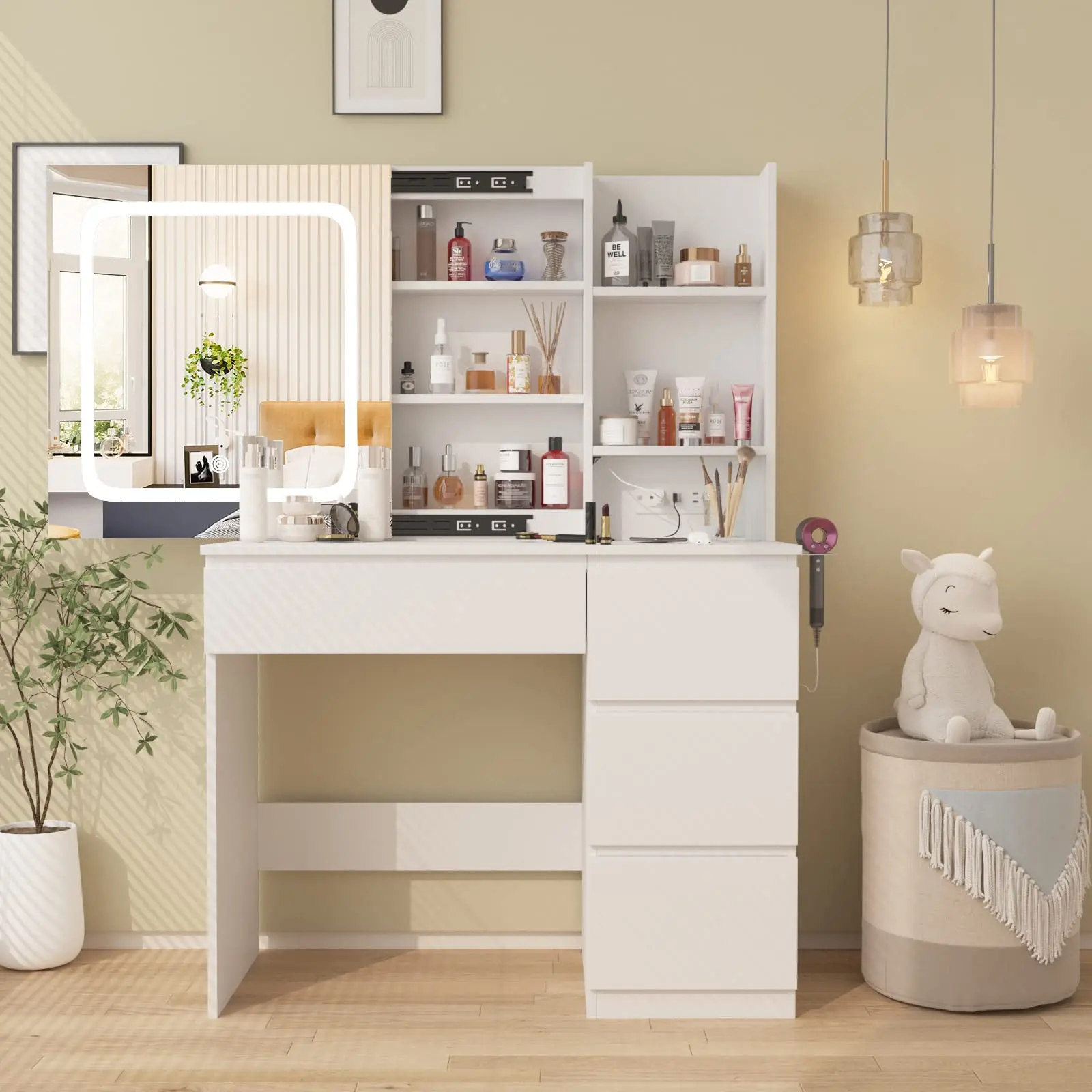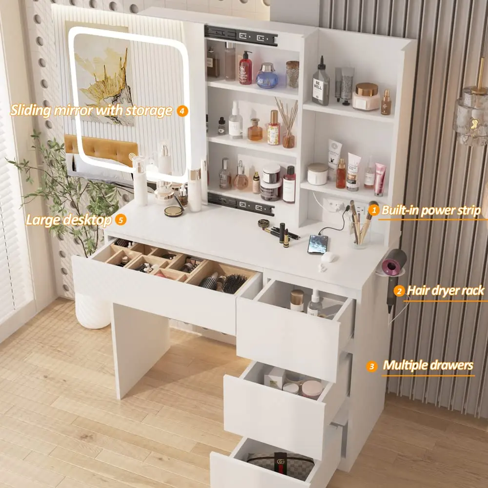 Vabches' Vanity with Lighted Sliding Mirror and Lots Storage Space