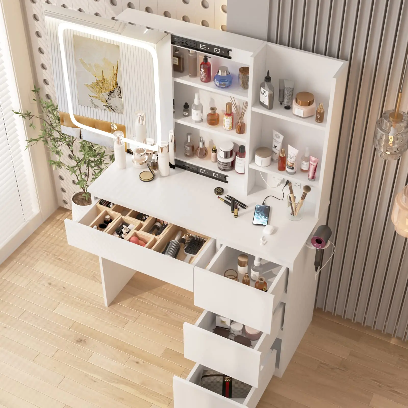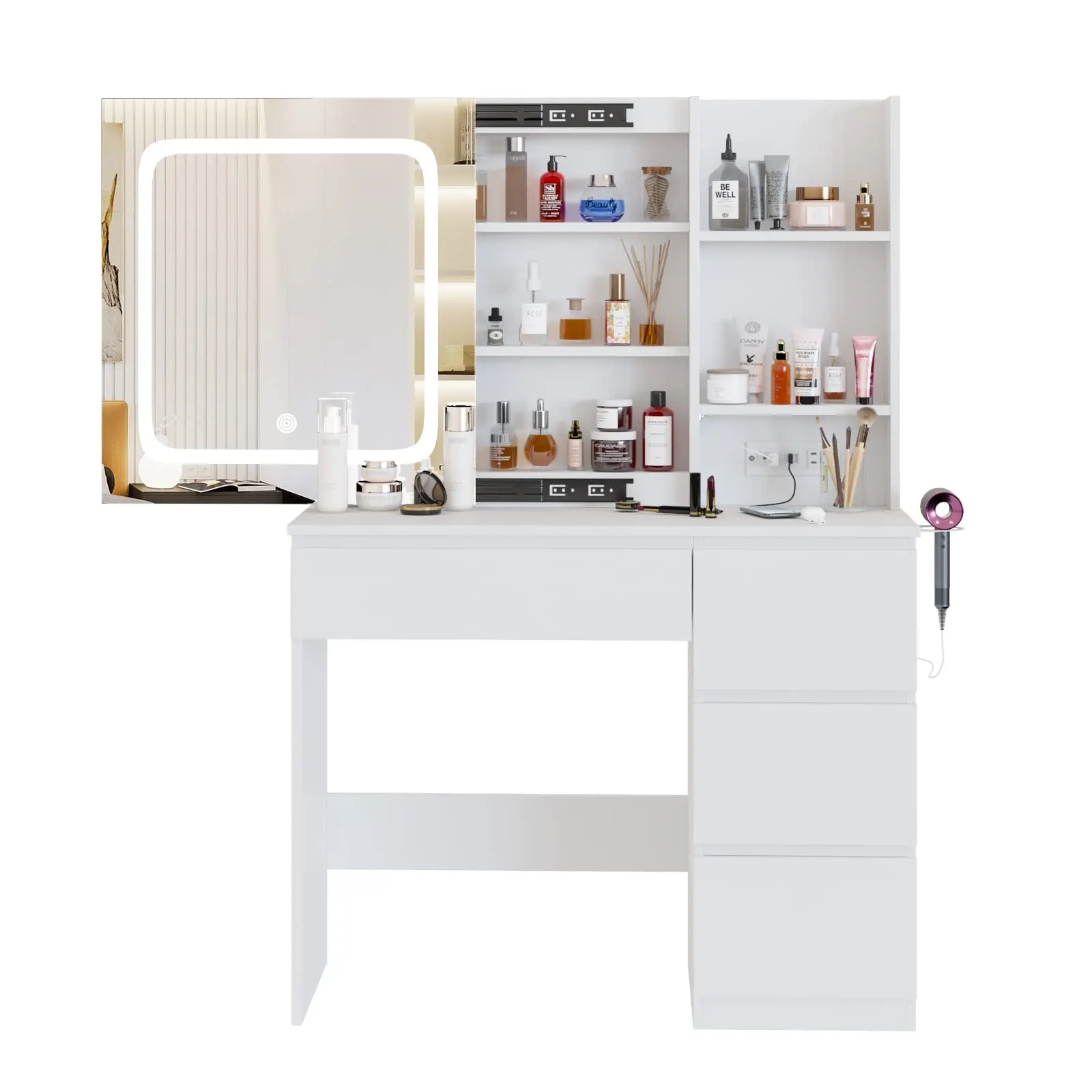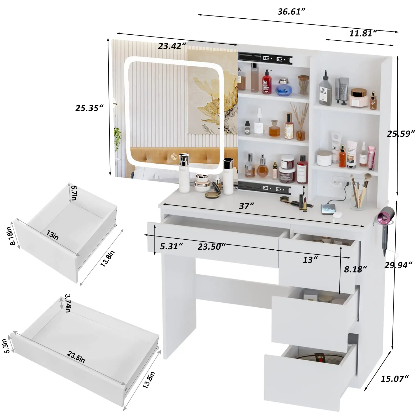 ·Contains 1+3 drawers, 3 open shelves and 3-layer hidden storage shelves behind the Lighted mirror, esily store all of your costmetics.