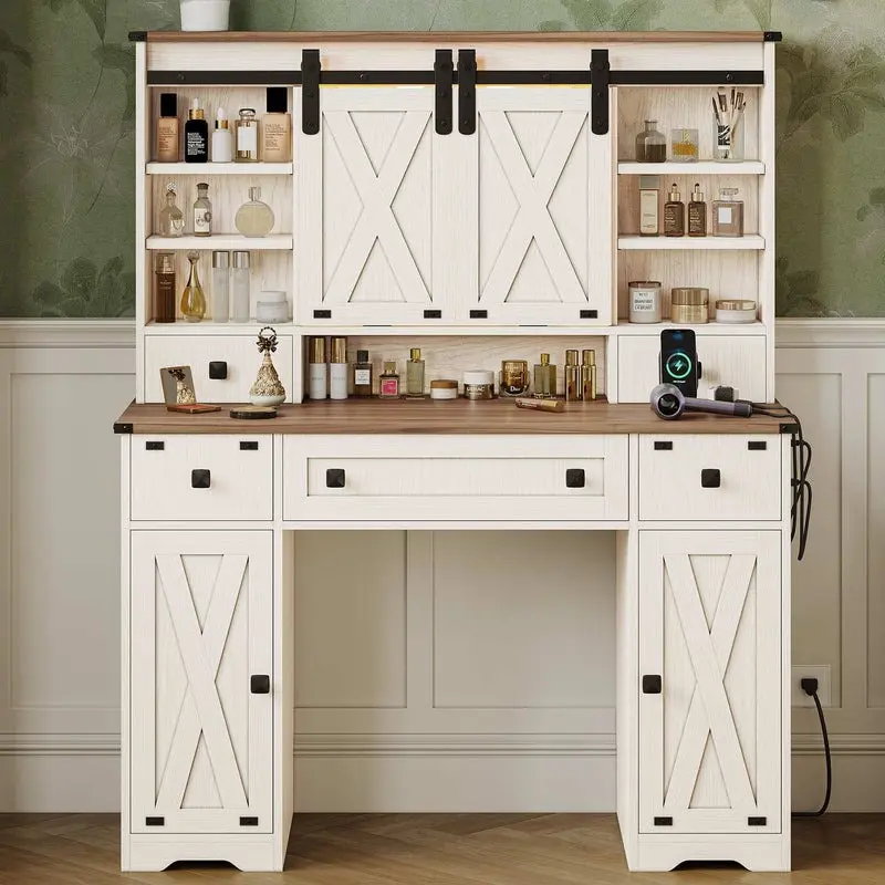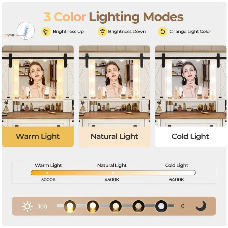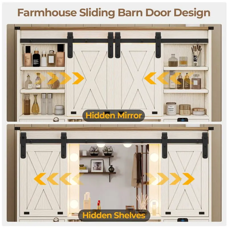 Sikaic Farmhouse Makeup Vanity Desk Mirror With Sliding Barn Door 3 Lighting Modes Adjustable And Charging Station White Furniture Bedroom Storage Drawer Modern Wood DresserSikaic Farmhouse Makeup Vanity Desk Mirror With Sliding Barn Door 3 Lighting Modes Adjustable And Charging Station White Furniture Bedroom Storage Drawer Modern Wood Dresser