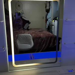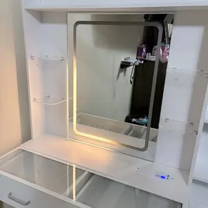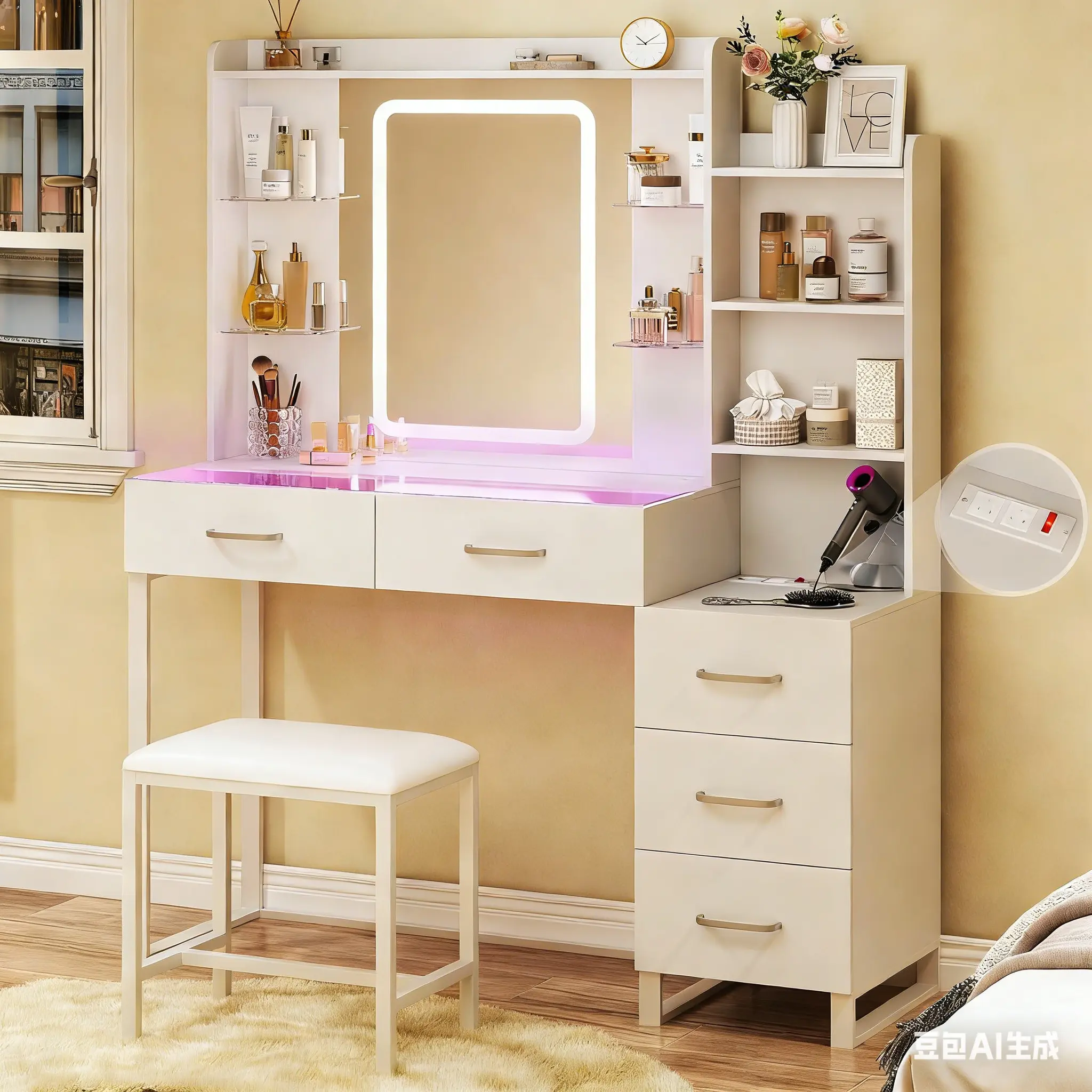 ·Glass-Top Vanity with RGB DrawersA transparent glass surface lets you easily view your items, while adjustable shelves and 5-color LED drawers add a stylish touch.