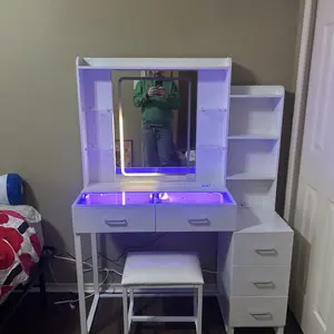 ·Glass top Vanity with RGB Drawers: The glass is unique and transparent, so you can see everything in the makeup vanity with lights, and the shelves are adjustable. It's got built-in LED lights with five color modes, so it'll look great in any room