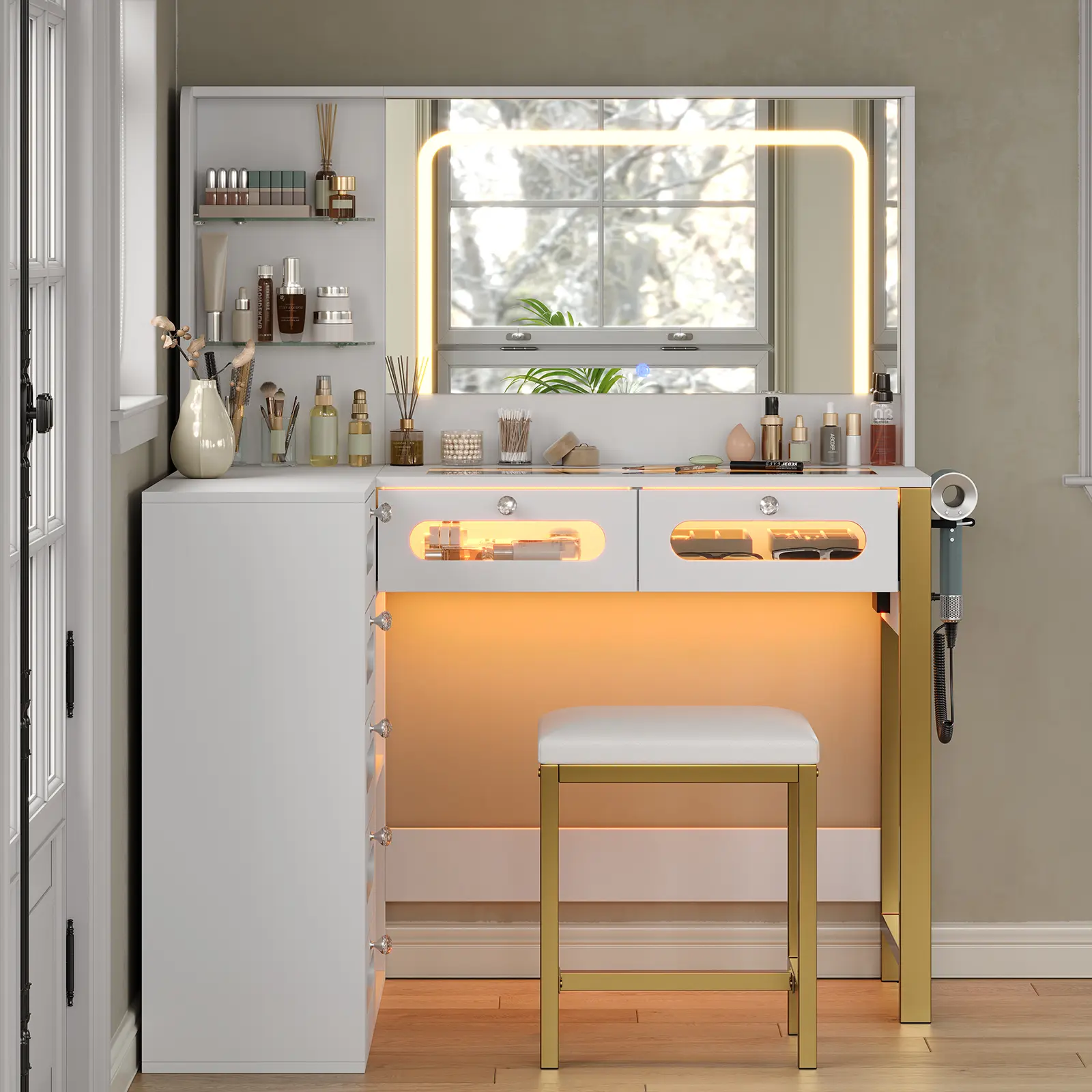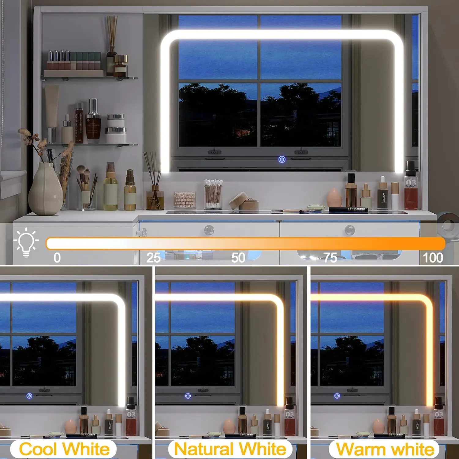 ·LED Mirror with 3 Light Modes: This makeup vanity desk features a mirror with built-in LED light strip, which is more safe and beautiful than common bulbs. Provide 3 different light modes: Tap to switch between cool white, warm white, or warm yellow, and press longer to adjust brightness for the nice look-day or night