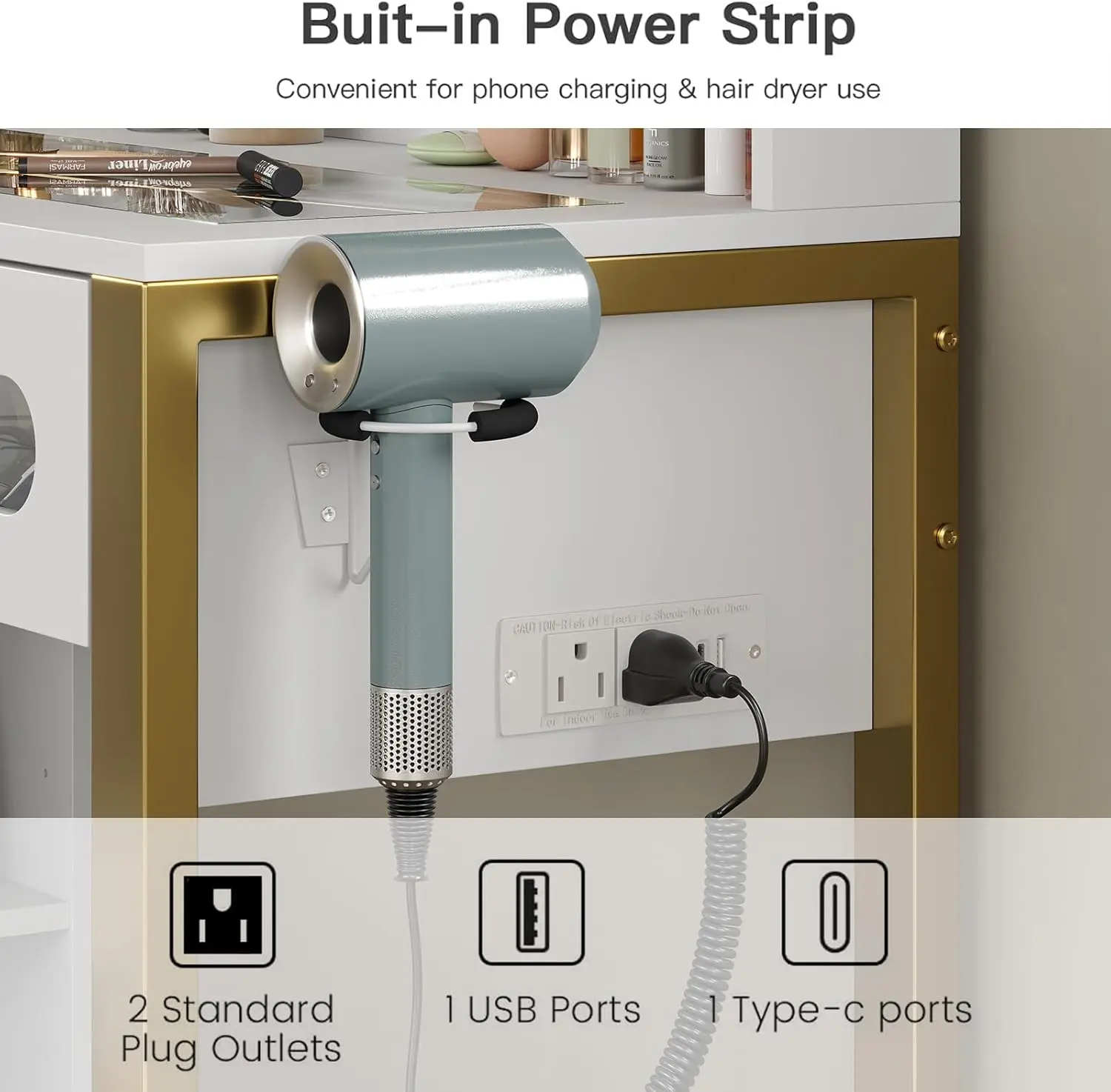 ·Power Outlet & Hair Dryer Rack: With 2 AC outlets, 1 USB and 1 Type-C ports a hair dryer rack, this vanity desk help you easy access to your hair dryer, cell phone, curling iron and etc. You can do everything at the vanity without having to walk around.
